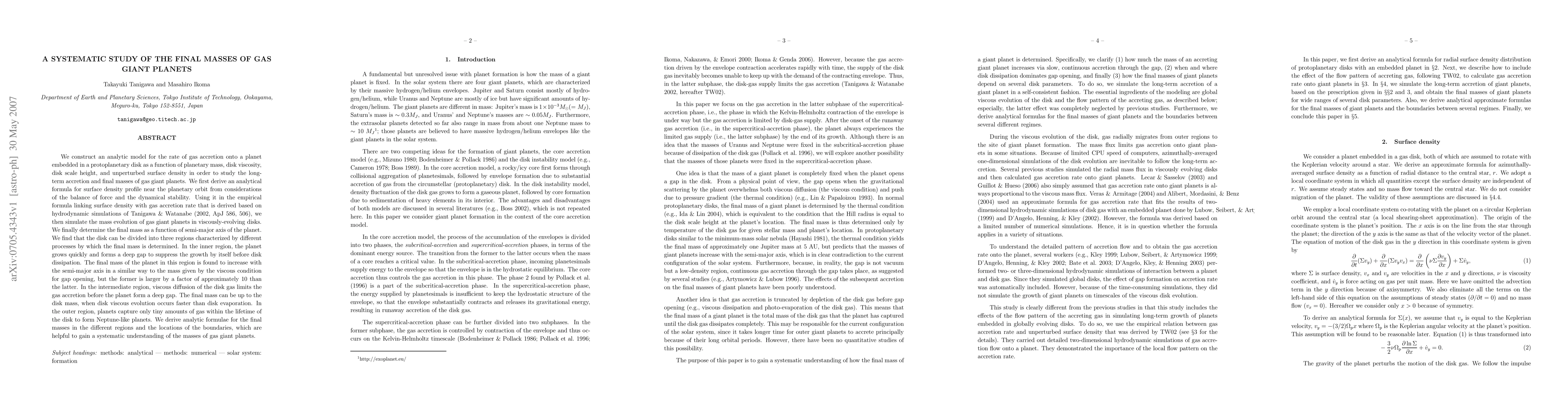This study develops an analytic model to explore the gas accretion process and final masses of gas giant planets in protoplanetary disks. It finds that the disk can be divided into three regions with distinct mass-determining processes, leading to derived analytic formulae for final masses and boundary locations.
