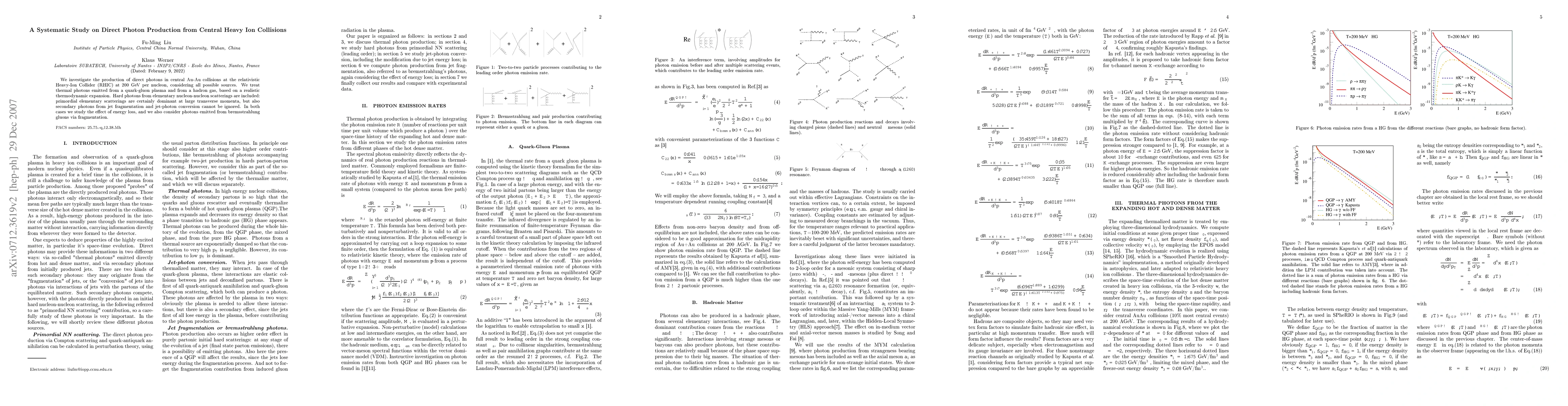 This study examines direct photon production in central Au-Au collisions at RHIC, considering thermal photons from quark-gluon plasma and hadron gas, hard photons from nucleon-nucleon scatterings, and secondary photons from jet fragmentation and conversion. The research also evaluates the impact of energy loss and photon emission from bremsstrahlung gluons.