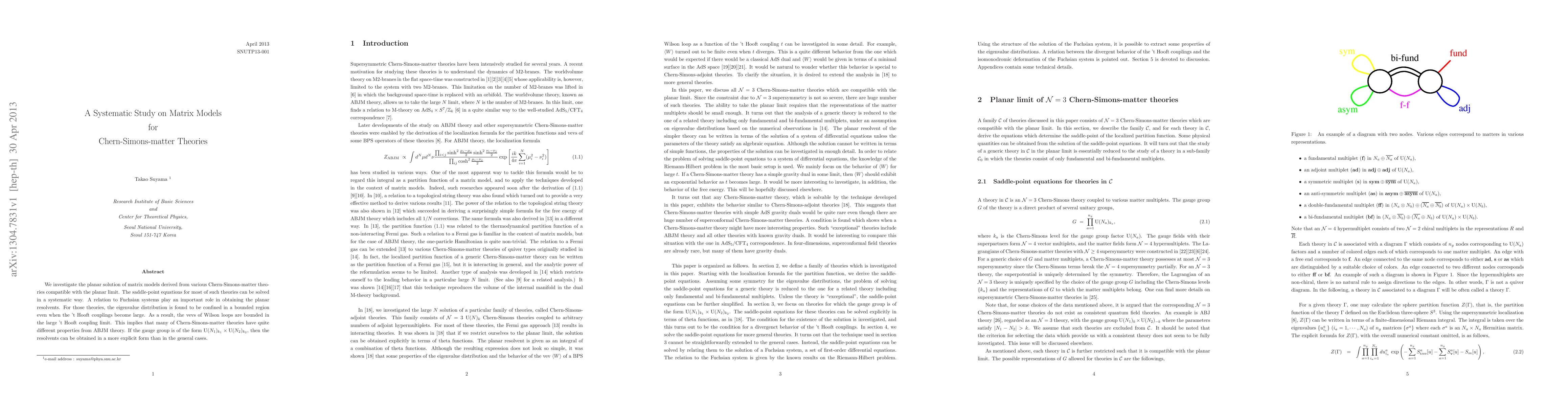 This paper systematically studies matrix models from Chern-Simons-matter theories, finding that their planar resolvents are related to Fuchsian systems. The eigenvalue distribution remains bounded even with large 't Hooft couplings, leading to bounded Wilson loop vevs, contrasting with ABJM theory properties.