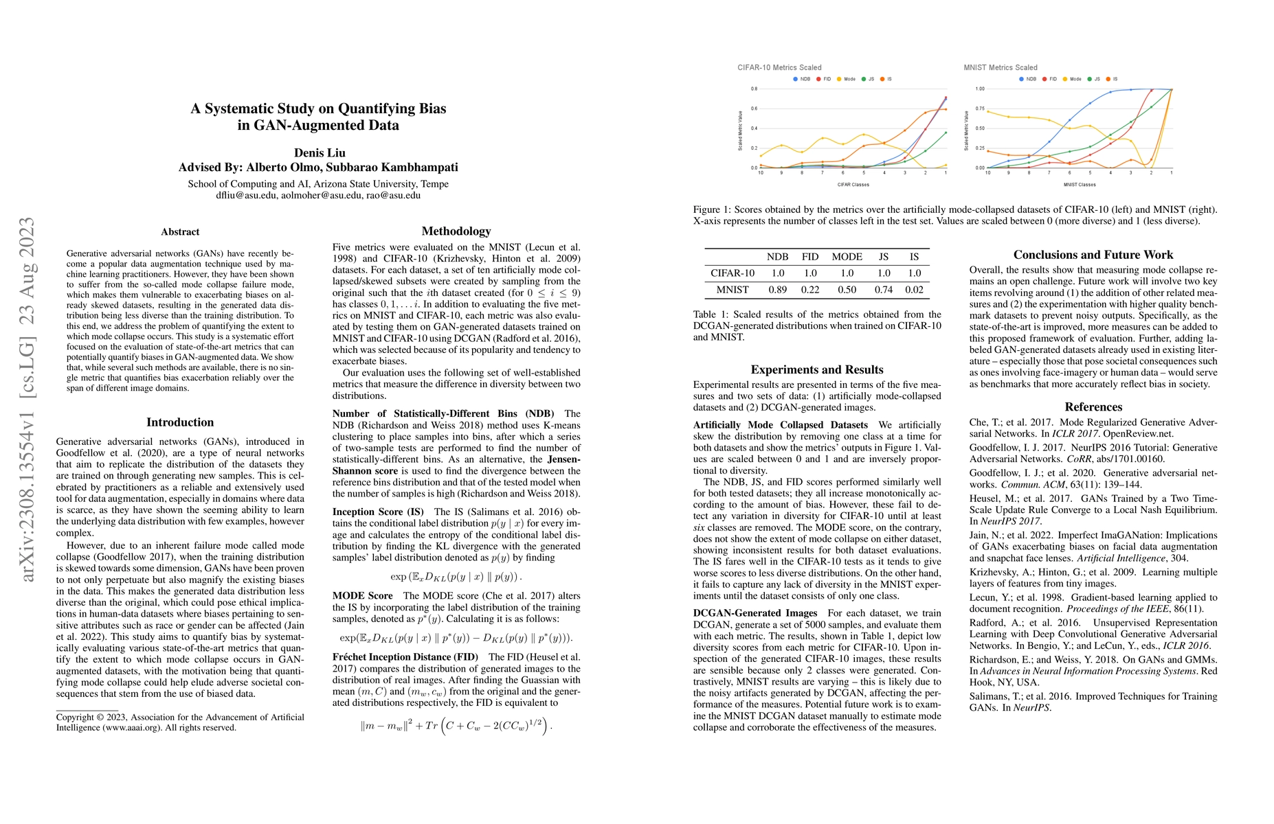 This study systematically evaluates metrics for quantifying bias in GAN-augmented data, finding that while various methods exist, none reliably measure bias across different image domains due to the mode collapse issue.