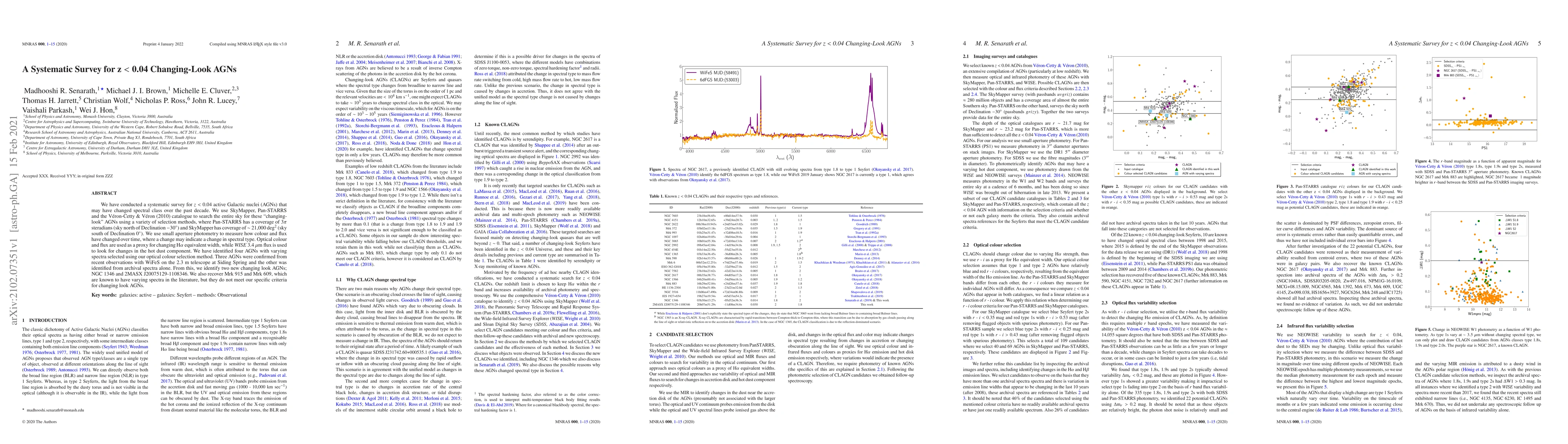 We have conducted a systematic survey for z $<$ 0.04 active Galactic nuclei (AGNs) that may have changed spectral class over the past decade. We use SkyMapper, Pan-STARRS and the V\'eron-Cetty & V\'eron (2010) catalogue to search the entire sky for these ``changing-look'' AGNs using a variety of selection methods, where Pan-STARRS has a coverage of 3$\pi$ steradians (sky north of Declination $-30^\circ$) and SkyMapper has coverage of $\sim$ 21,000$~\rm{deg^2}$ (sky south of Declination $0^\circ$). We use small aperture photometry to measure how colour and flux have changed over time, where a change may indicate a change in spectral type. Optical colour and flux are used as a proxy for changing H$\alpha$ equivalent width, while WISE 3.4 $\mu$m flux is used to look for changes in the hot dust component. We have identified four AGNs with varying spectra selected using our optical colour selection method. Three AGNs were confirmed from recent observations with WiFeS on the 2.3 m telescope at Siding Spring and the other was identified from archival spectra alone. From this, we identify two new changing look AGNs; NGC 1346 and 2MASX J20075129-1108346. We also recover Mrk 915 and Mrk 609, which are known to have varying spectra in the literature, but they do not meet our specific criteria for changing look AGNs.