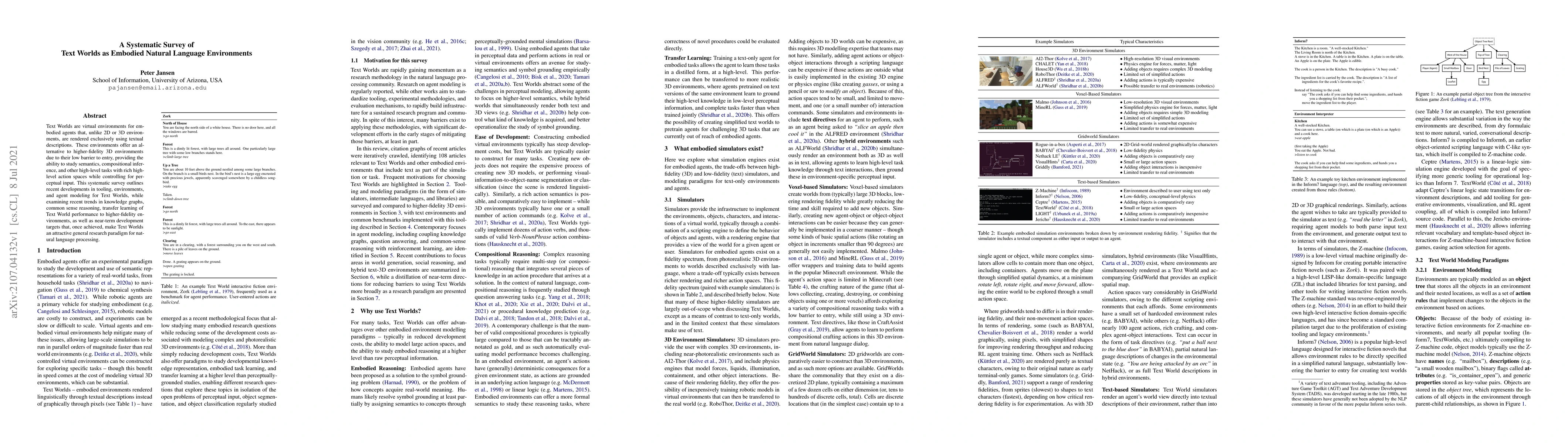 This paper systematically surveys Text Worlds, textual environments for embodied agents, highlighting recent advancements in tooling, environments, and agent modeling. It explores trends in knowledge graphs, common sense reasoning, and transfer learning, aiming to establish Text Worlds as a compelling paradigm for natural language processing research.