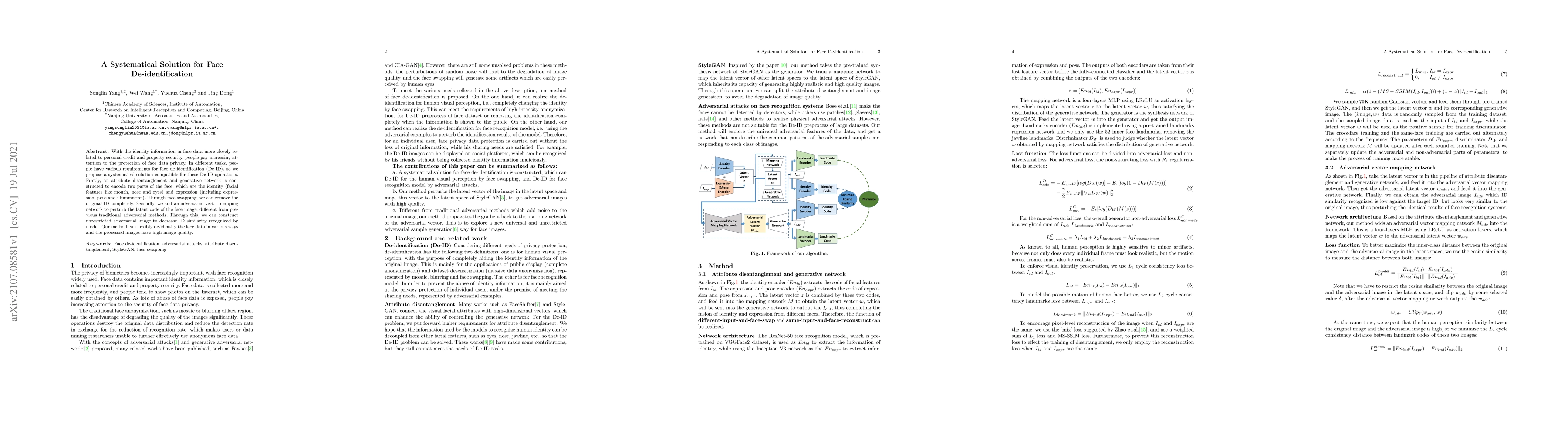 This paper proposes a systematic solution for face de-identification, utilizing an attribute disentanglement and generative network to separate identity and expression features, and a novel adversarial vector mapping network to create high-quality, ID-free face images. The method offers flexible de-identification options while maintaining image quality.