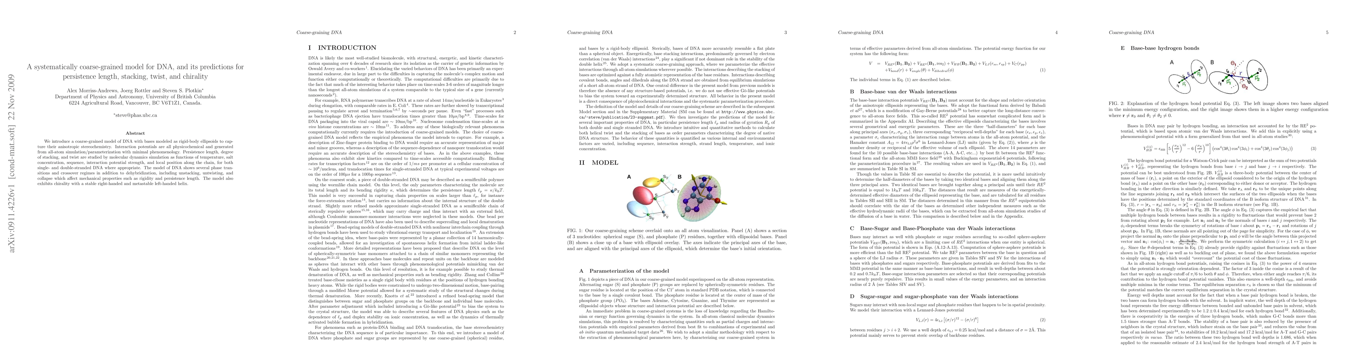 This paper presents a coarse-grained model of DNA using rigid-body ellipsoids for bases, derived from all-atom simulations. It predicts persistence length, stacking, twist, and chirality, revealing phase transitions and crossover regimes affecting mechanical properties.