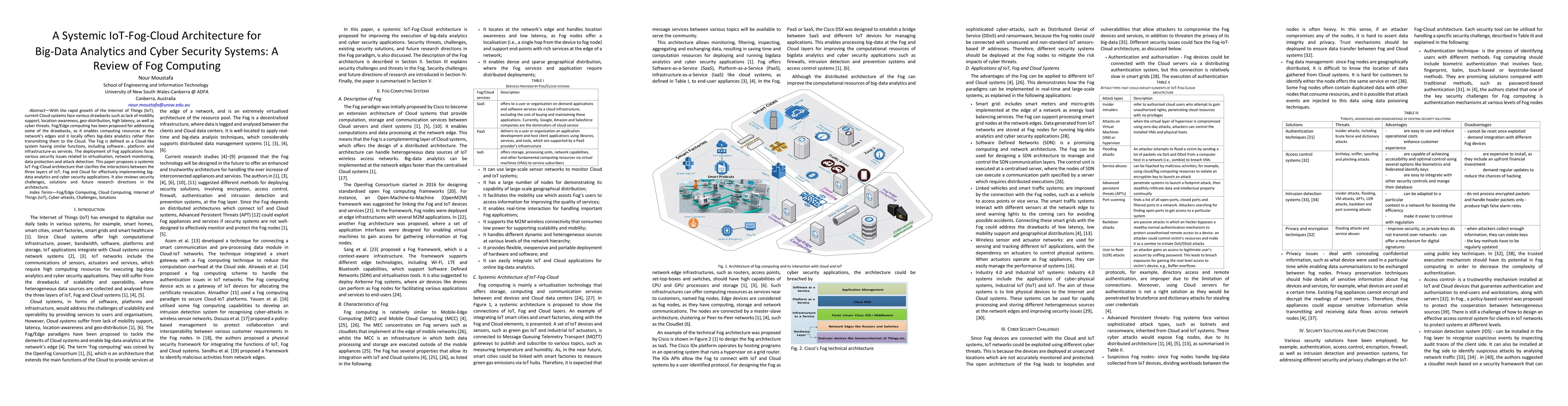 Abstract--- With the rapid growth of the Internet of Things (IoT), current Cloud systems face various drawbacks such as lack of mobility support, location-awareness, geo-distribution, high latency, as well as cyber threats. Fog/Edge computing has been proposed for addressing some of the drawbacks, as it enables computing resources at the network's edges and it locally offers big-data analytics rather than transmitting them to the Cloud. The Fog is defined as a Cloud-like system having similar functions, including software-, platform- and infrastructure-as services. The deployment of Fog applications faces various security issues related to virtualisation, network monitoring, data protection and attack detection. This paper proposes a systemic IoT-Fog-Cloud architecture that clarifies the interactions between the three layers of IoT, Fog and Cloud for effectively implementing big-data analytics and cyber security applications. It also reviews security challenges, solutions and future research directions in the architecture.