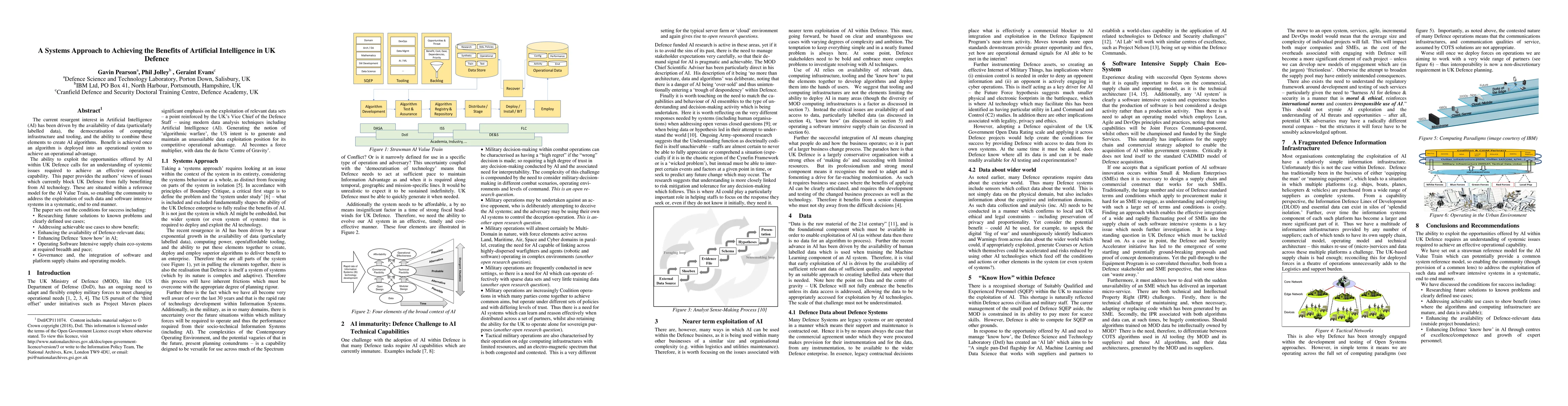 A systems approach is needed to fully benefit from AI in UK Defence, addressing issues such as data availability, software supply chain management, and governance. The paper outlines conditions for success including research, use cases, data enhancement, and integration of software and platform supply chains.
