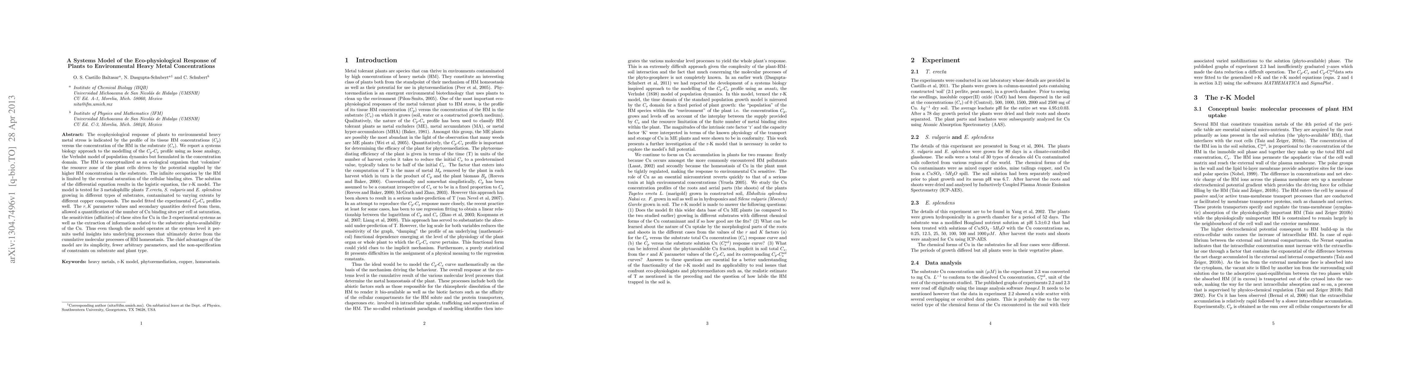 The ecophysiological response of plants to environmental heavy metal stress is indicated by the profile of its tissue HM concentrations (Cp) versus the concentration of the HM in the substrate (Cs). We report a systems biology approach to the modelling of the Cp- Cs profile using as loose analogy, the Verhulst model of population dynamics but formulated in the concentration domain. The HM is conceptualized as an ecological organism that `colonizes' the resource zone of the plant cells driven by the potential supplied by the higher HM concentration in the substrate. The infinite occupation by the HM is limited by the eventual saturation of the cellular binding sites. The solution of the differential equation results in the logistic equation, the r-K model. The model is tested for 3 metalophillic plants T.erecta, S. vulgaris and E. splendens growing in different types of substrates, contaminated to varying extents by different copper compounds. The model fitted the experimental Cp- Cs profiles well. The r, K parameter values and secondary quantities derived from them, allowed a quantification of the number of Cu binding sites per cell at saturation, the sensitivities (affinities) of these sites for Cu in the 3 experimental systems as well as the extraction of information related to the substrate phyto-availability of the Cu. Thus even though the model operates at the systems level it permits useful insights into underlying processes that ultimately derive from the cumulative molecular processes of HM homeostasis. The chief advantages of the model are its simplicity, fewer arbitrary parameters, and the non-specification of constraints on substrate and plant type.