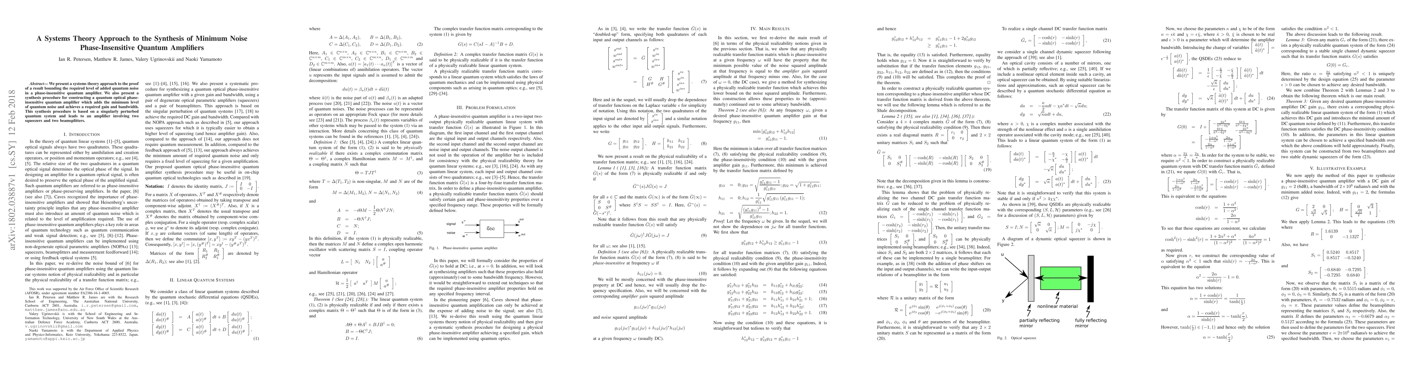 Researchers develop a systems theory approach to design phase-insensitive quantum amplifiers with minimal added noise, using two squeezers and two beamsplitters in their synthesis procedure.