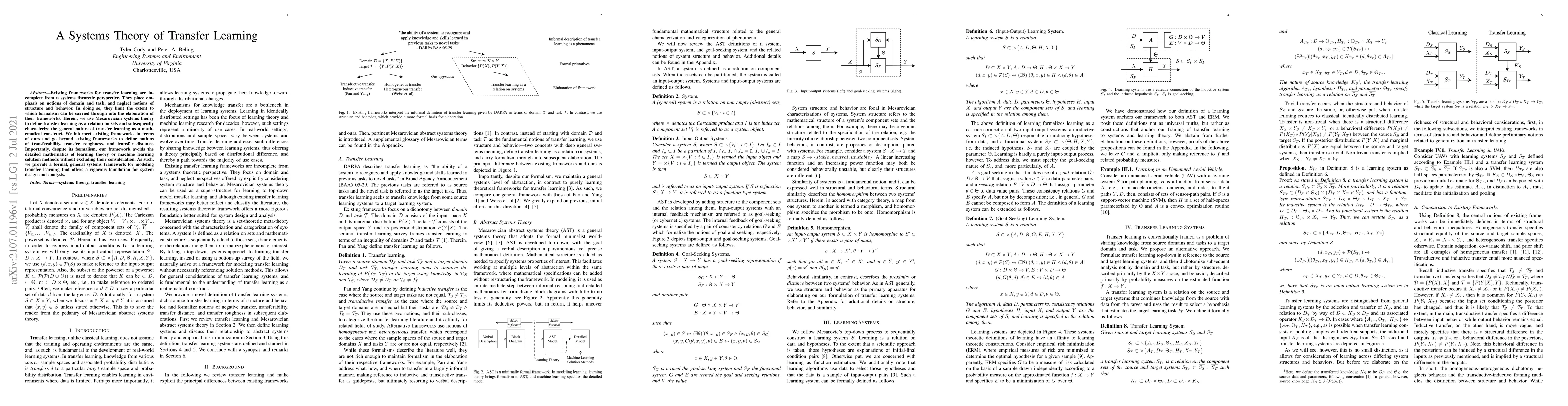 Existing frameworks for transfer learning are incomplete from a systems theoretic perspective. They place emphasis on notions of domain and task, and neglect notions of structure and behavior. In doing so, they limit the extent to which formalism can be carried through into the elaboration of their frameworks. Herein, we use Mesarovician systems theory to define transfer learning as a relation on sets and subsequently characterize the general nature of transfer learning as a mathematical construct. We interpret existing frameworks in terms of ours and go beyond existing frameworks to define notions of transferability, transfer roughness, and transfer distance. Importantly, despite its formalism, our framework avoids the detailed mathematics of learning theory or machine learning solution methods without excluding their consideration. As such, we provide a formal, general systems framework for modeling transfer learning that offers a rigorous foundation for system design and analysis.