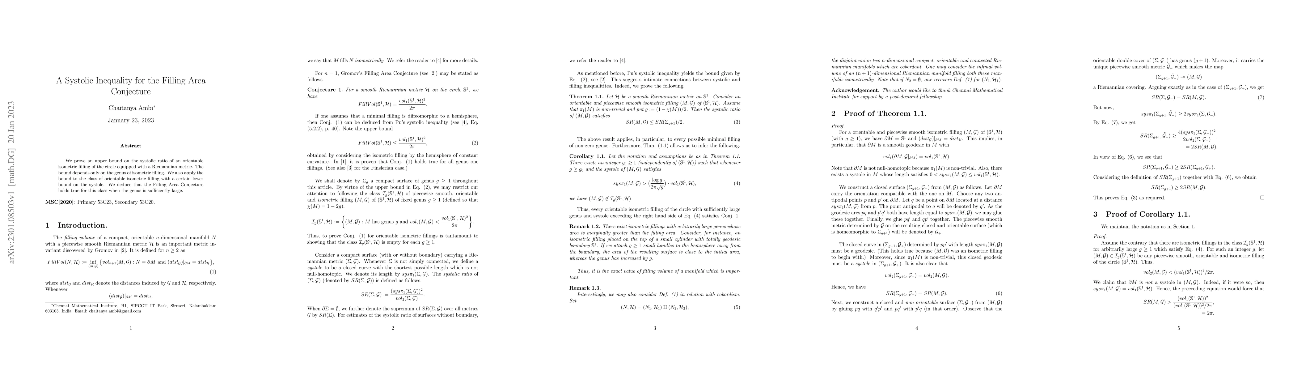The paper establishes an upper bound on the systolic ratio for orientable isometric fillings of the circle, dependent solely on the genus. It demonstrates that the Filling Area Conjecture holds for a specific class of fillings with a sufficiently large genus.