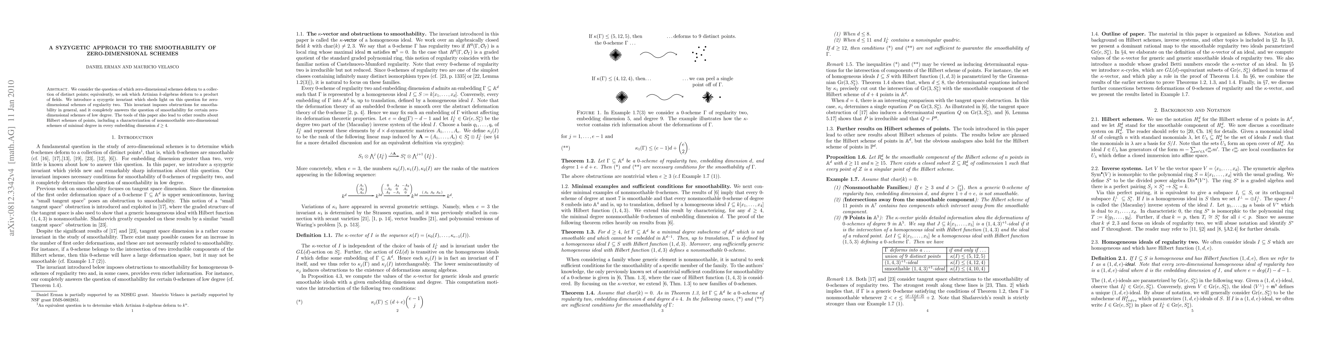 We consider the question of which zero-dimensional schemes deform to a collection of distinct points; equivalently, we ask which Artinian k-algebras deform to a product of fields. We introduce a syzygetic invariant which sheds light on this question for zero-dimensional schemes of regularity two. This invariant imposes obstructions for smoothability in general, and it completely answers the question of smoothability for certain zero-dimensional schemes of low degree. The tools of this paper also lead to other results about Hilbert schemes of points, including a characterization of nonsmoothable zero-dimensional schemes of minimal degree in every embedding dimension d\geq 4.