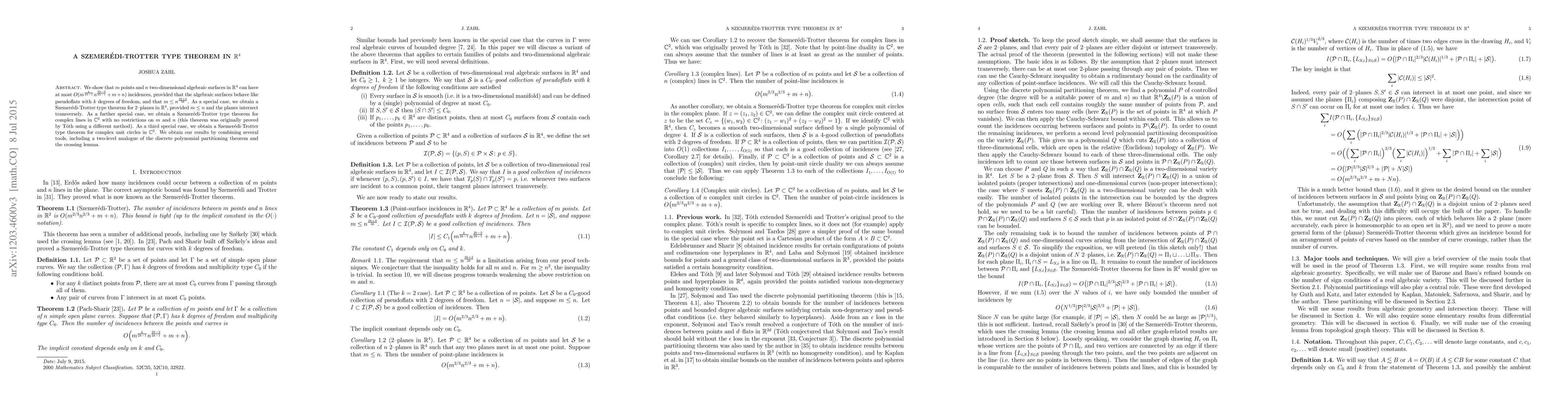 Researchers prove a Szemeredi-Trotter type theorem for 2D surfaces in R^4, showing that the maximum number of incidences is bounded by O(m^(k/(2k-1))n^(2k-2/(2k-1))+m+n), with special cases for planes and unit circles.