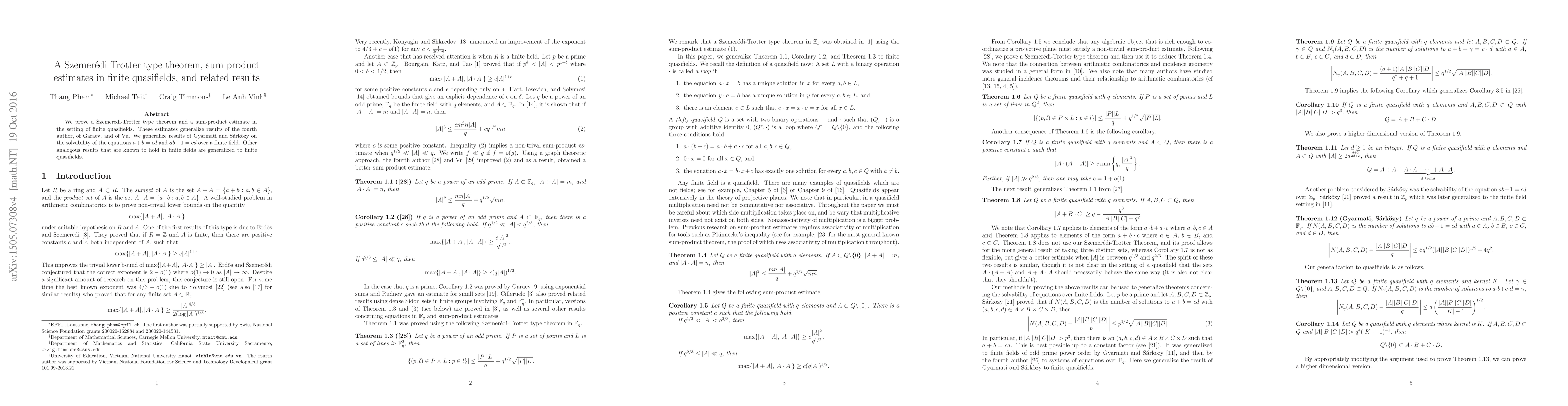 This paper proves a Szemer\'edi-Trotter type theorem and a sum-product estimate in finite quasifields, generalizing prior results from finite fields. It also extends the solvability of specific equations in finite quasifields, mirroring findings in finite fields.