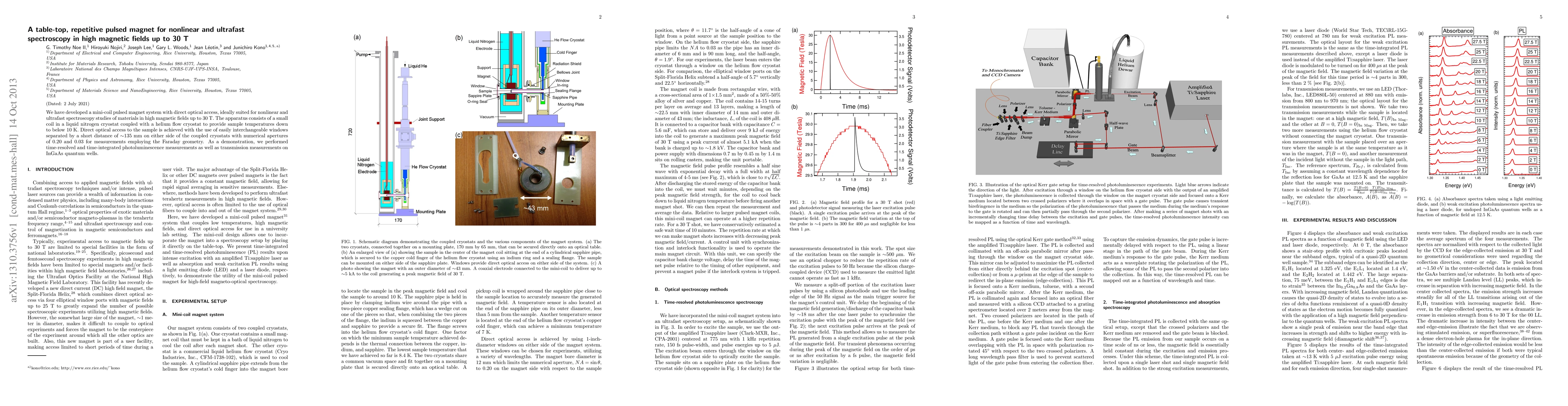 This paper presents a mini-coil pulsed magnet system for nonlinear and ultrafast spectroscopy in magnetic fields up to 30 T, featuring direct optical access and sample temperatures below 10 K. Demonstrations include time-resolved photoluminescence and transmission measurements on InGaAs quantum wells.