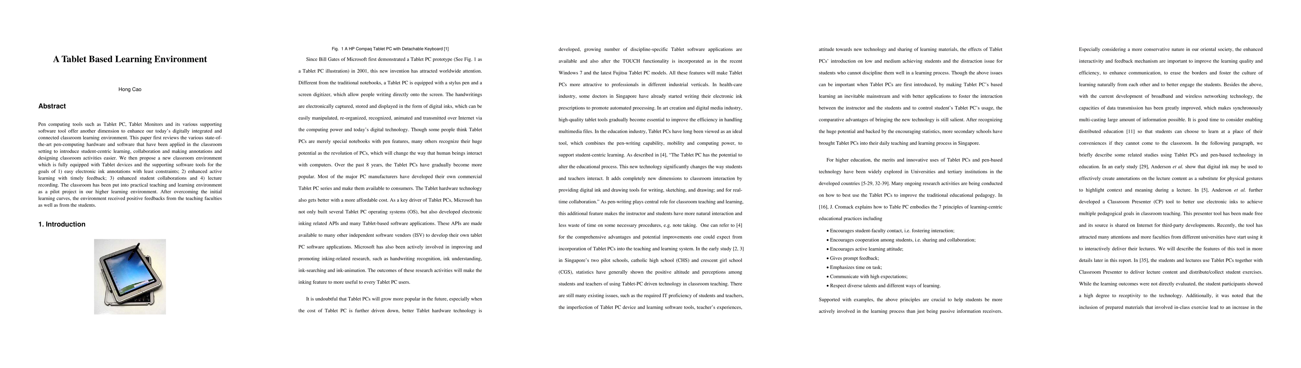 This paper reviews state-of-the-art pen-computing tools applied in classrooms and proposes a tablet-based learning environment aimed at enhancing annotations, active learning, collaboration, and lecture recording. The pilot project in a higher education setting received positive feedback from both faculty and students after initial adaptation.