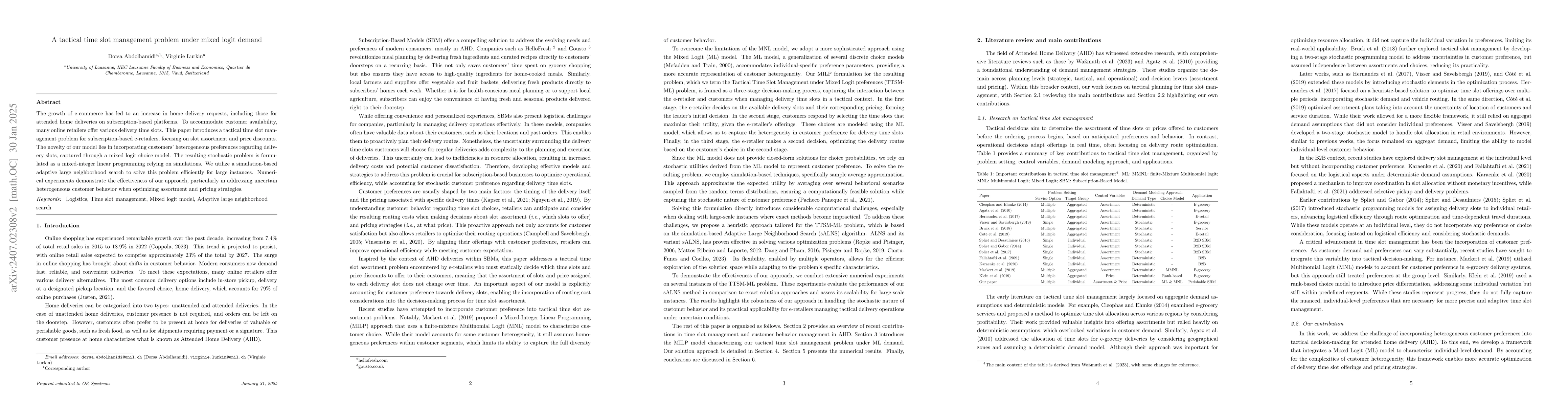 This paper presents a tactical time slot management problem for subscription-based e-retailers, addressing slot assortment and price discounts under heterogeneous customer preferences modeled with a mixed logit choice framework. The stochastic optimization problem is solved using a simulation-based adaptive large neighborhood search, demonstrating effectiveness in optimizing strategies amidst uncertain customer behavior.