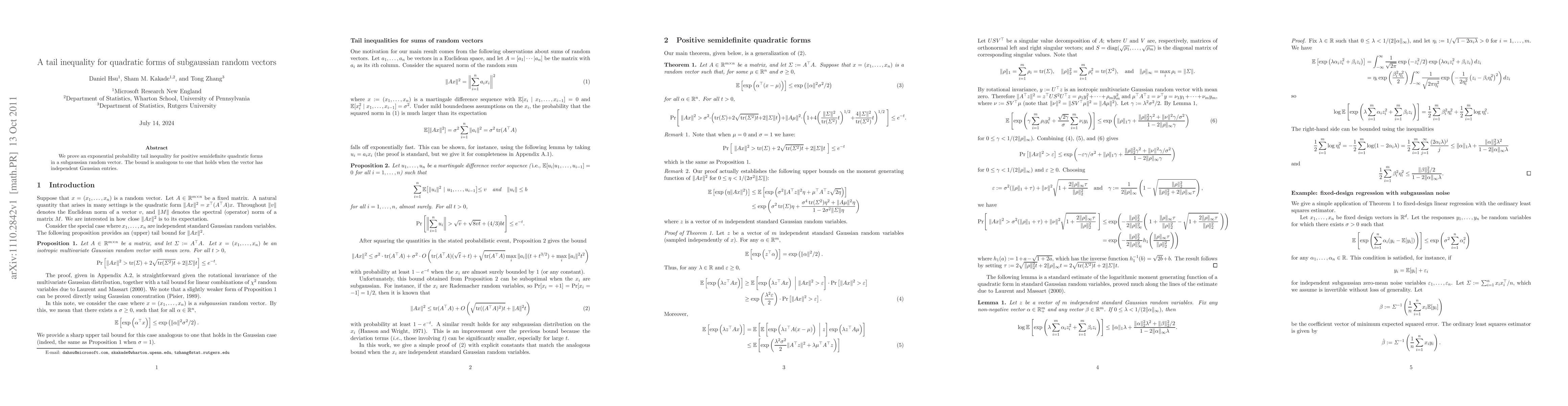 Summary: This paper establishes an exponential tail inequality for positive semidefinite quadratic forms in subgaussian random vectors, providing a bound similar to that for Gaussian vectors with independent entries.