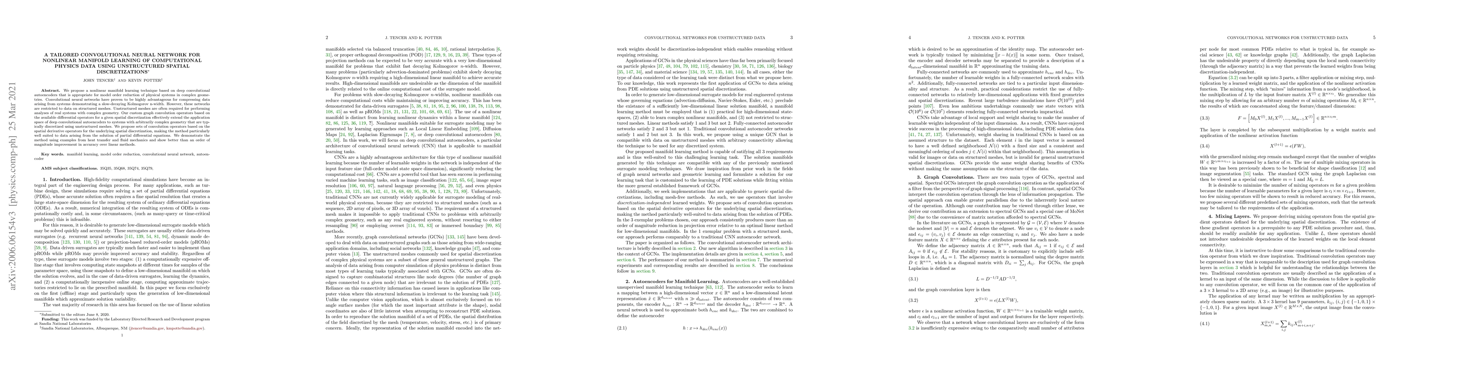 This paper proposes a tailored convolutional neural network for nonlinear manifold learning, extending deep convolutional autoencoders to unstructured spatial discretizations for complex geometries. The custom graph convolution operators based on differential operators significantly improve accuracy for data from partial differential equations, demonstrating substantial gains over linear methods.