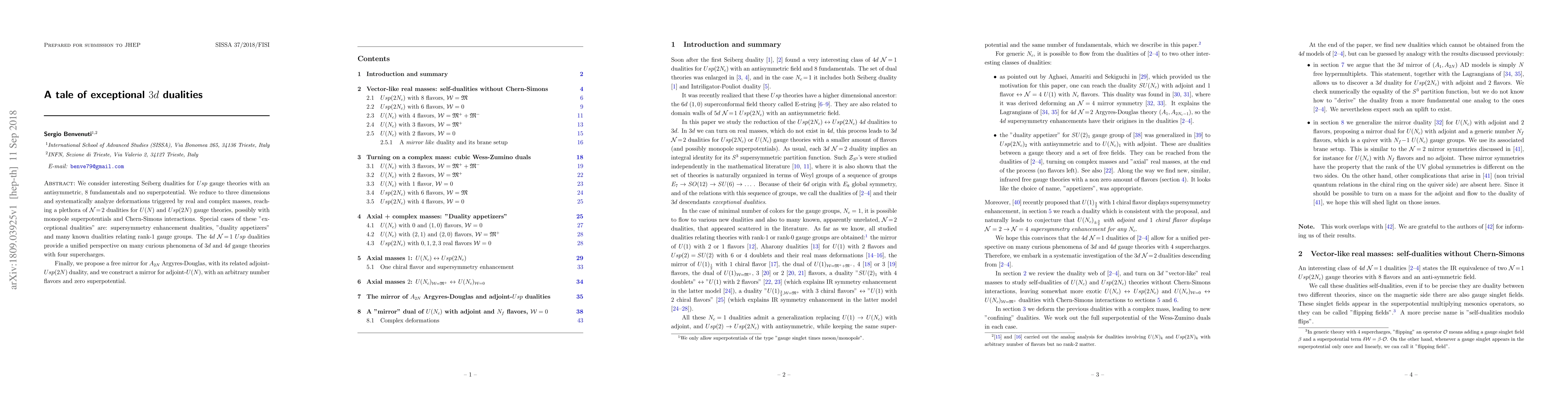 We consider interesting Seiberg dualities for $Usp$ gauge theories with an antisymmetric, $8$ fundamentals and no superpotential. We reduce to three dimensions and systematically analyze deformations triggered by real and complex masses, reaching a plethora of $\mathcal{N}\!=\!2$ dualities for $U(N)$ and $Usp(2N)$ gauge theories, possibly with monopole superpotentials and Chern-Simons interactions. Special cases of these "exceptional dualities" are: supersymmetry enhancement dualities, "duality appetizers" and many known dualities relating rank-$1$ gauge groups. The $4d$ $\mathcal{N}\!=\!1$ $Usp$ dualities provide a unified perspective on many curious phenomena of $3d$ and $4d$ gauge theories with four supercharges. Finally, we propose a free mirror for $A_{2N}$ Argyres-Douglas, with its related adjoint-$Usp(2N)$ duality, and we construct a mirror for adjoint-$U(N)$, with an arbitrary number flavors and zero superpotential.