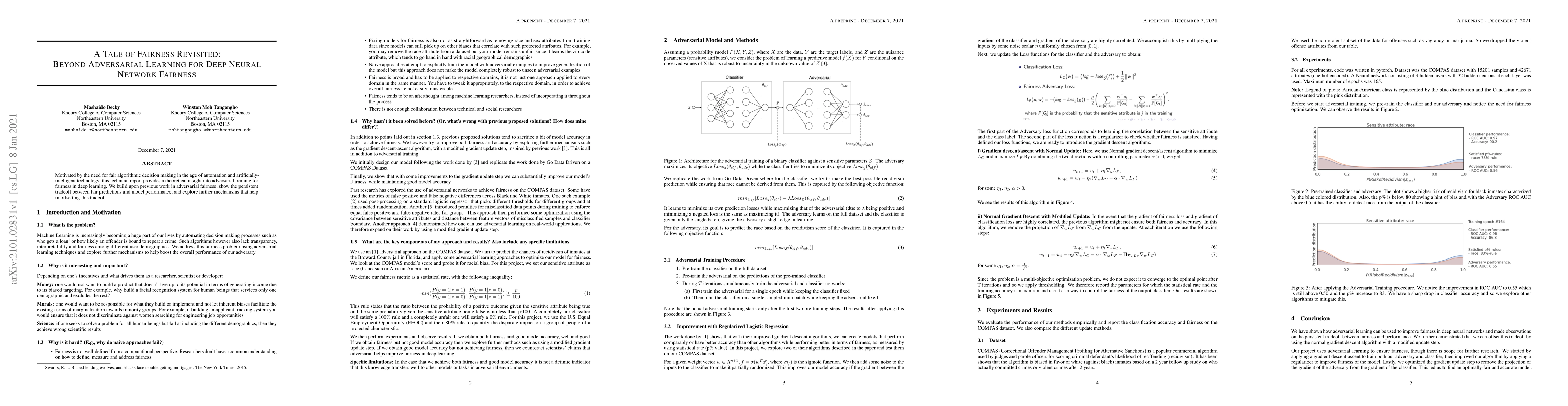 Motivated by the need for fair algorithmic decision making in the age of automation and artificially-intelligent technology, this technical report provides a theoretical insight into adversarial training for fairness in deep learning. We build upon previous work in adversarial fairness, show the persistent tradeoff between fair predictions and model performance, and explore further mechanisms that help in offsetting this tradeoff.