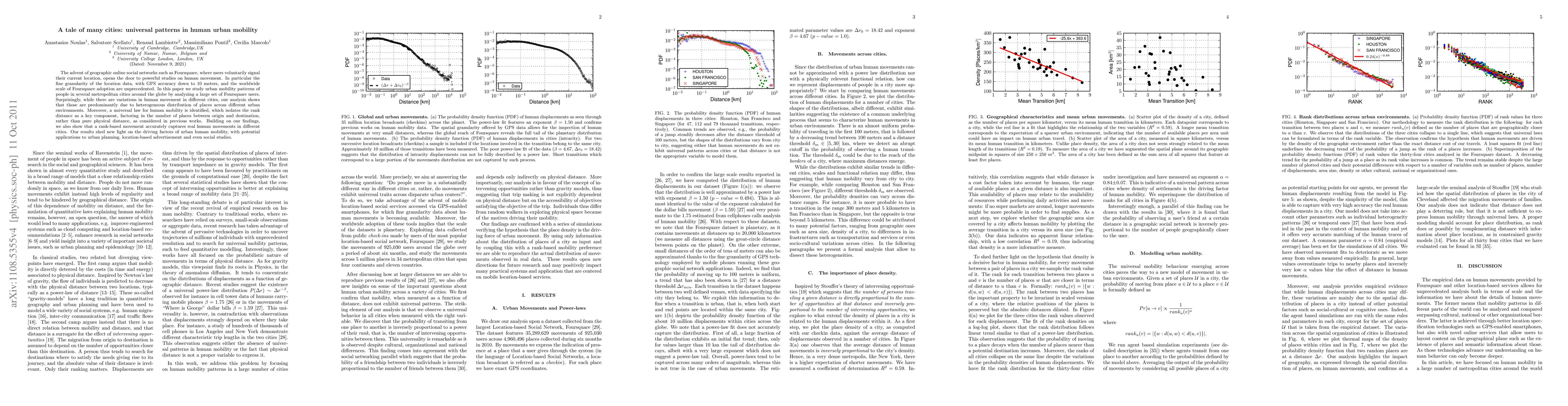 This paper analyzes urban mobility patterns across several global cities using Foursquare data, revealing universal human movement laws based on rank-distance rather than physical distance. The findings suggest that variations in movement are primarily due to the distribution of places, with implications for urban planning and location-based services.
