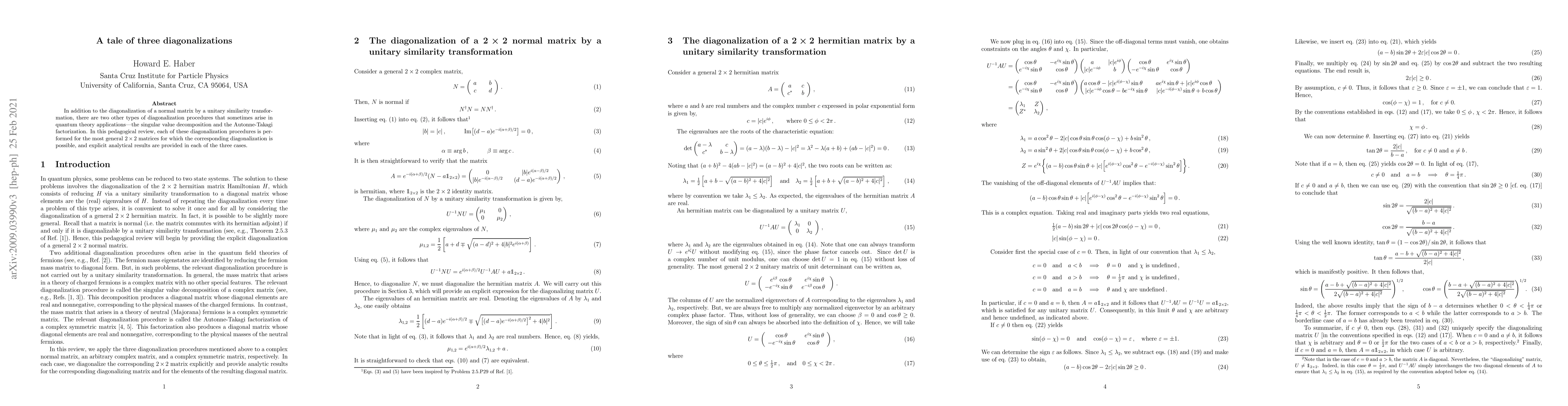 In addition to the diagonalization of a normal matrix by a unitary similarity transformation, there are two other types of diagonalization procedures that sometimes arise in quantum theory applications -- the singular value decomposition and the Autonne-Takagi factorization. In these pedagogical notes, we carry out each of these diagonalization procedures for the most general $2\times 2$ matrices for which the corresponding diagonalization is possible and provide explicit analytical results in each of the three cases.