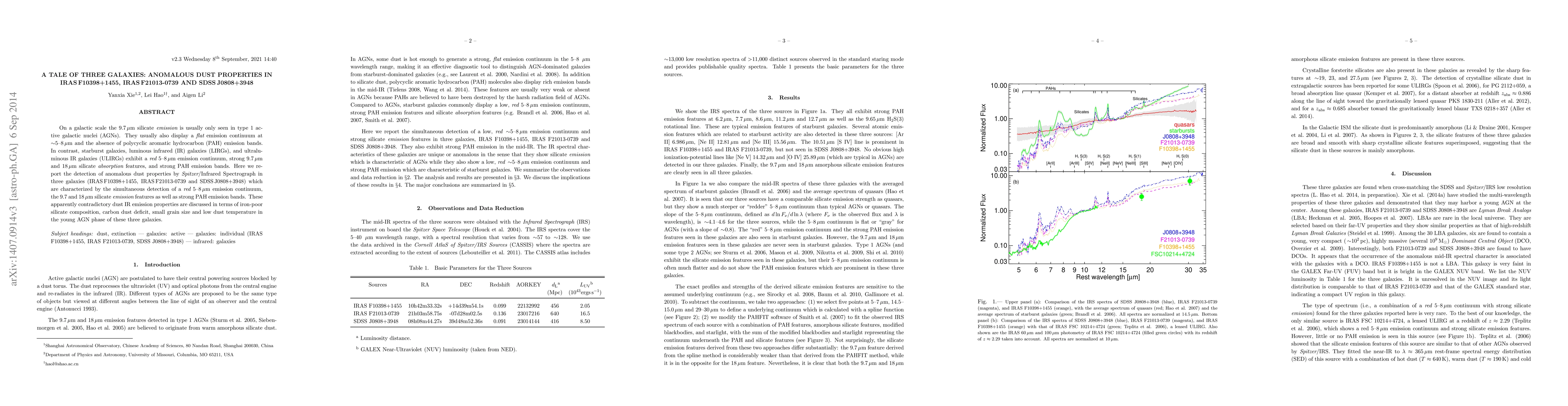 On a galactic scale the 9.7um silicate emission is usually only seen in type 1 active galactic nuclei (AGNs). They usually also display a flat emission continuum at ~5--8um and the absence of polycyclic aromatic hydrocarbon (PAH) emission bands. In contrast, starburst galaxies, luminous infrared (IR) galaxies (LIRGs), and ultraluminous IR galaxies (ULIRGs) exhibit a red 5--8um emission continuum, strong 10um and 18um silicate absorption features, and strong PAH emission bands. Here we report the detection of anomalous dust properties by Spitzer/Infrared Spectrograph in three galaxies (IRASF10398+1455, IRASF21013-0739 and SDSSJ0808+3948) which are characterized by the simultaneous detection of a red 5--8um emission continuum, the 9.7 and 18um silicate emission features as well as strong PAH emission bands. These apparently contradictory dust IR emission properties are discussed in terms of iron-poor silicate composition, carbon dust deficit, small grain size and low dust temperature in the young AGN phase of these three galaxies.
