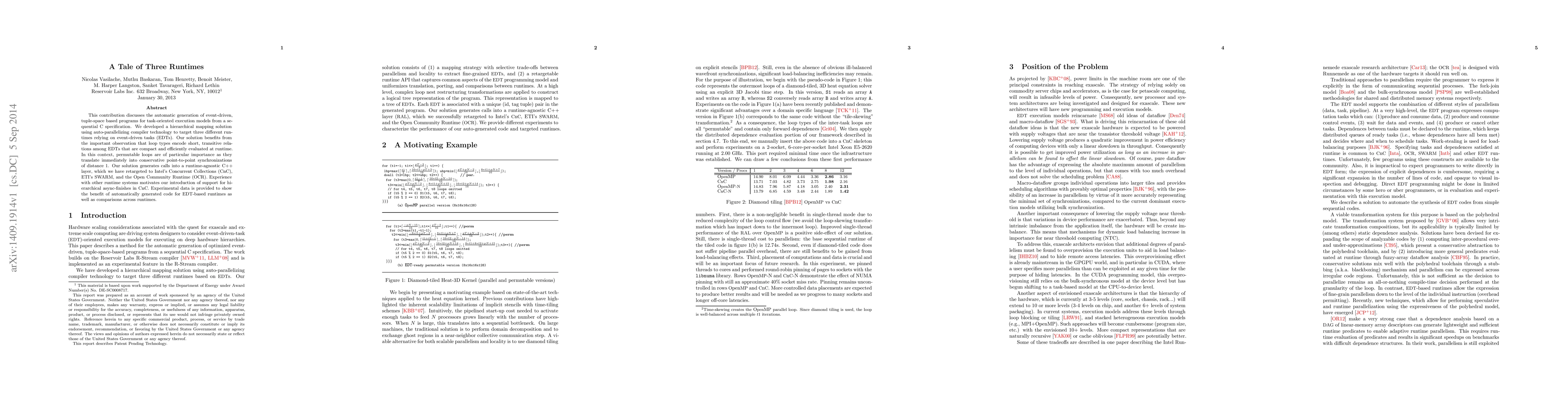 This contribution discusses the automatic generation of event-driven, tuple-space based programs for task-oriented execution models from a sequential C specification. We developed a hierarchical mapping solution using auto-parallelizing compiler technology to target three different runtimes relying on event-driven tasks (EDTs). Our solution benefits from the important observation that loop types encode short, transitive relations among EDTs that are compact and efficiently evaluated at runtime. In this context, permutable loops are of particular importance as they translate immediately into conservative point-to-point synchronizations of distance 1. Our solution generates calls into a runtime-agnostic C++ layer, which we have retargeted to Intel's Concurrent Collections (CnC), ETI's SWARM, and the Open Community Runtime (OCR). Experience with other runtime systems motivates our introduction of support for hierarchical async-finishes in CnC. Experimental data is provided to show the benefit of automatically generated code for EDT-based runtimes as well as comparisons across runtimes.