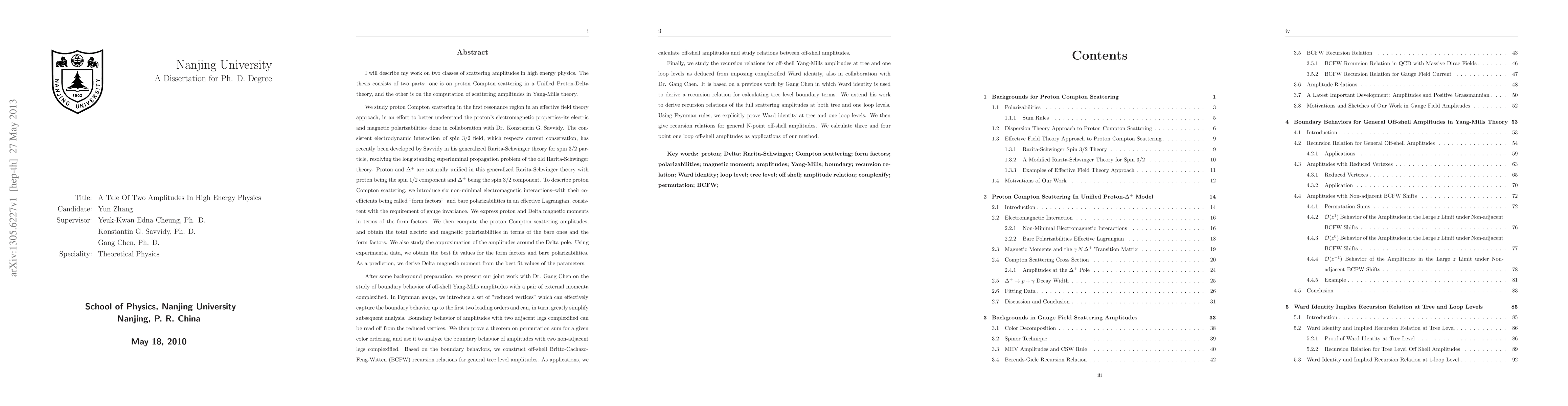 (abbreviated) I will describe my work on proton Compton scattering in a Unified Proton-Delta theory and on the computation of scattering amplitudes in Yang-Mills theory. We study proton Compton scattering in the first resonance region in an effective field theory approach with adviser Dr. Konstantin G. Savvidy. Proton and $\Delta^+$ are naturally unified in the generalized Rarita-Schwinger theory proposed by Savvidy. We introduce six non-minimal electromagnetic interactions--with their coefficients being called "form factors"--and bare polarizabilities in an effective Lagrangian. We express proton and Delta magnetic moments and the electromagnetic polarizabilities in terms of the bare polarizabilities and the form factors. We fit the form factors and bare polarizabilities using experimental data and derive Delta magnetic moment from the best fit values of the parameters. Then I present our joint work with adviser Dr. Gang Chen on the study of boundary behavior of off-shell Yang-Mills amplitudes with a pair of external momenta complexified. In Feynman gauge, we introduce a set of "reduced vertices" which can capture the boundary behavior up to the first two leading orders. We then prove a theorem on permutation sum for a given color ordering, and use it to analyze the boundary behavior of amplitudes with two non-adjacent legs complexified. Then we construct off-shell Britto-Cachazo-Feng-Witten (BCFW) recursion relations and study relations between off-shell amplitudes. Finally, we study the recursion relations for off-shell Yang-Mills amplitudes at tree and one loop levels as deduced from imposing complexified Ward identity, also in collaboration with Dr. Gang Chen.