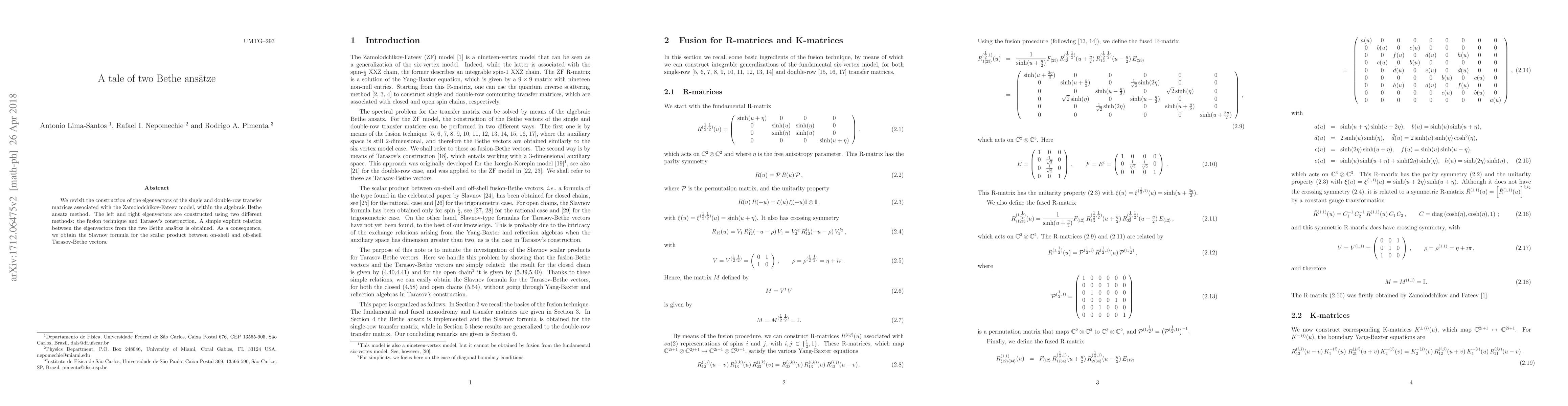 We revisit the construction of the eigenvectors of the single and double-row transfer matrices associated with the Zamolodchikov-Fateev model, within the algebraic Bethe ansatz method. The left and right eigenvectors are constructed using two different methods: the fusion technique and Tarasov's construction. A simple explicit relation between the eigenvectors from the two Bethe ans\"atze is obtained. As a consequence, we obtain the Slavnov formula for the scalar product between on-shell and off-shell Tarasov-Bethe vectors.
