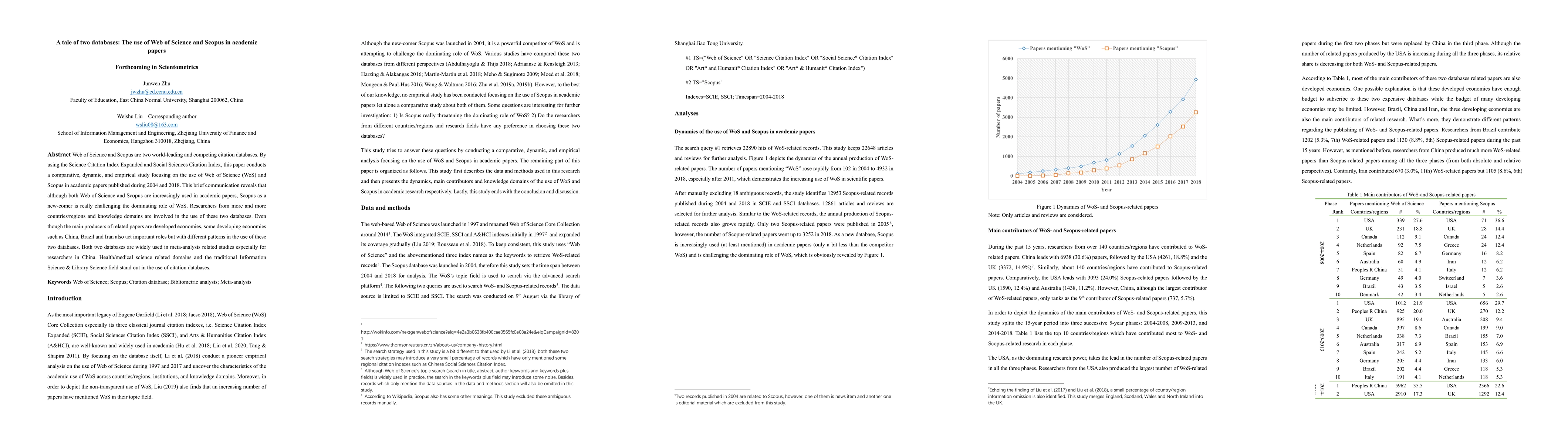 This paper compares the usage of Web of Science and Scopus in academic papers from 2004 to 2018, finding that while both databases are growing in popularity, Scopus is increasingly challenging Web of Science's dominance, with notable contributions from both developed and developing countries.