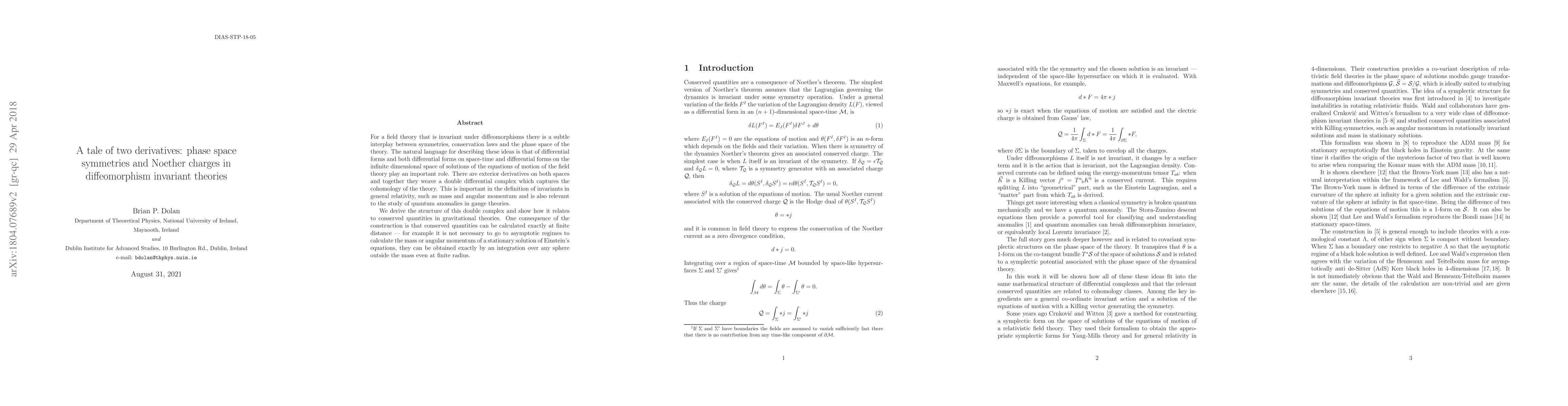 For a field theory that is invariant under diffeomorphisms there is a subtle interplay between symmetries, conservation laws and the phase space of the theory. The natural language for describing these ideas is that of differential forms and both differential forms on space-time and differential forms on the infinite dimensional space of solutions of the equations of motion of the field theory play an important role. There are exterior derivatives on both spaces and together they weave a double differential complex which captures the cohomology of the theory. This is important in the definition of invariants in general relativity, such as mass and angular momentum and is also relevant to the study of quantum anomalies in gauge theories. We derive the structure of this double complex and show how it relates to conserved quantities in gravitational theories. One consequence of the construction is that conserved quantities can be calculated exactly at finite distance --- for example it is not necessary to go to asymptotic regimes to calculate the mass or angular momentum of a stationary solution of Einstein's equations, they can be obtained exactly by an integration over any sphere outside the mass even at finite radius.