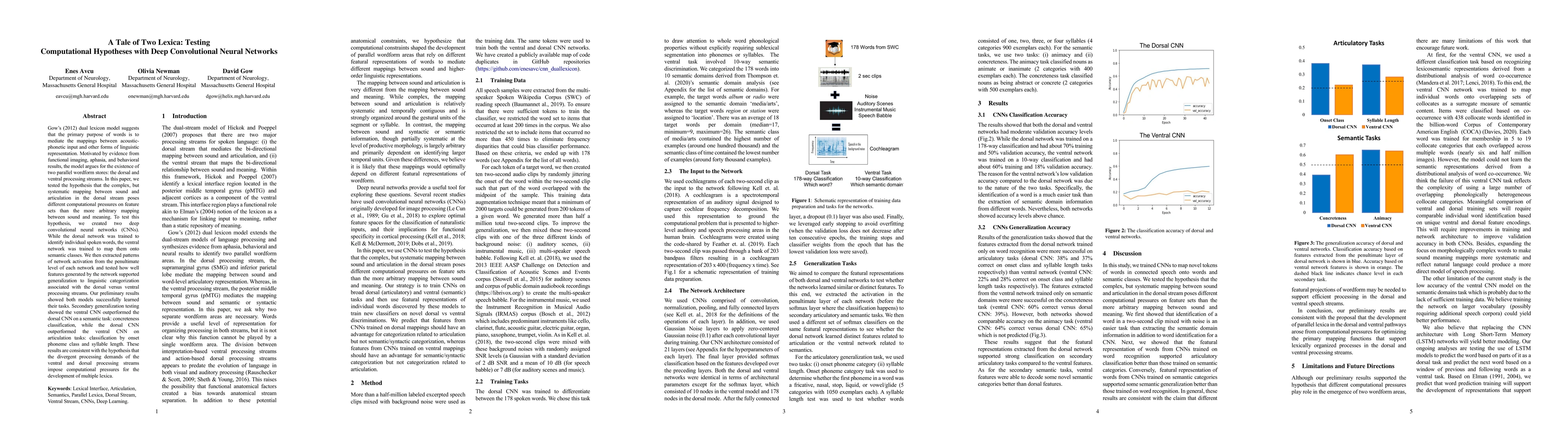 Gow's (2012) dual lexicon model suggests that the primary purpose of words is to mediate the mappings between acoustic-phonetic input and other forms of linguistic representation. Motivated by evidence from functional imaging, aphasia, and behavioral results, the model argues for the existence of two parallel wordform stores: the dorsal and ventral processing streams. In this paper, we tested the hypothesis that the complex, but systematic mapping between sound and articulation in the dorsal stream poses different computational pressures on feature sets than the more arbitrary mapping between sound and meaning. To test this hypothesis, we created two deep convolutional neural networks (CNNs). While the dorsal network was trained to identify individual spoken words, the ventral network was trained to map them onto semantic classes. We then extracted patterns of network activation from the penultimate level of each network and tested how well features generated by the network supported generalization to linguistic categorization associated with the dorsal versus ventral processing streams. Our preliminary results showed both models successfully learned their tasks. Secondary generalization testing showed the ventral CNN outperformed the dorsal CNN on a semantic task: concreteness classification, while the dorsal CNN outperformed the ventral CNN on articulation tasks: classification by onset phoneme class and syllable length. These results are consistent with the hypothesis that the divergent processing demands of the ventral and dorsal processing streams impose computational pressures for the development of multiple lexica.