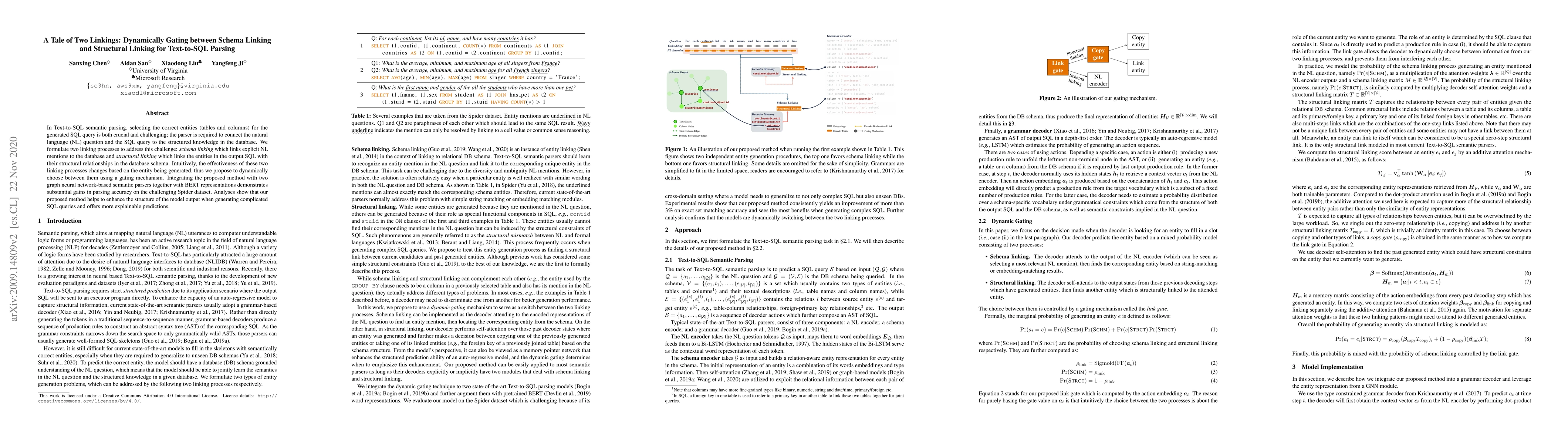 This paper proposes dynamically gating between schema linking and structural linking to improve Text-to-SQL parsing accuracy. The method enhances parsing performance and model output structure, especially for complex SQL queries, as demonstrated on the Spider dataset.