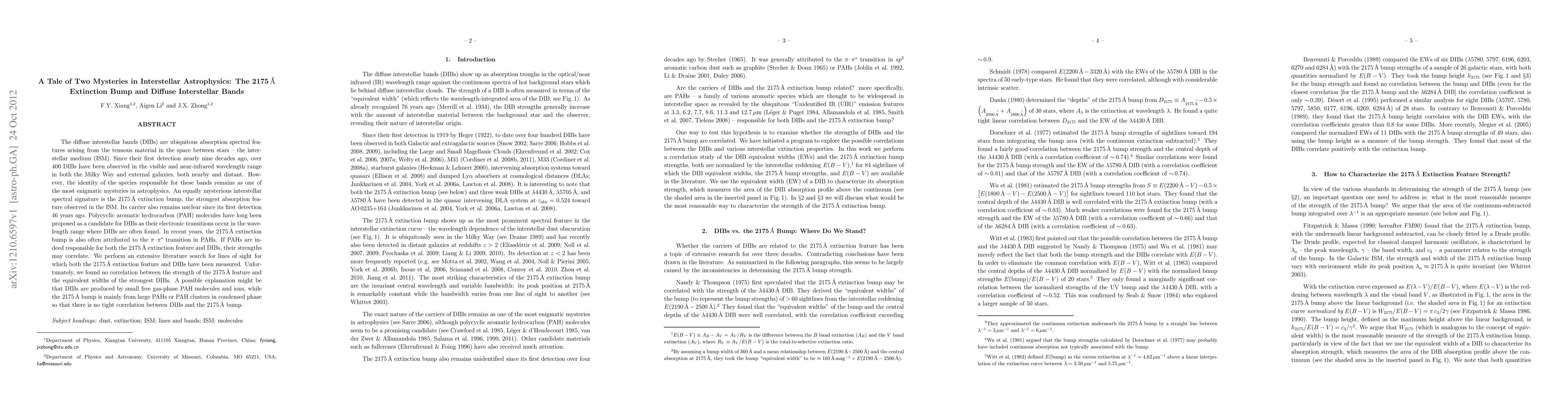 This paper investigates the correlation between the 2175 Angstrom extinction bump and diffuse interstellar bands (DIBs), both of which remain unidentified carriers in interstellar astrophysics. Despite PAHs being proposed as potential carriers for both, the study finds no correlation between their strengths, suggesting different PAH forms may be responsible for each feature.