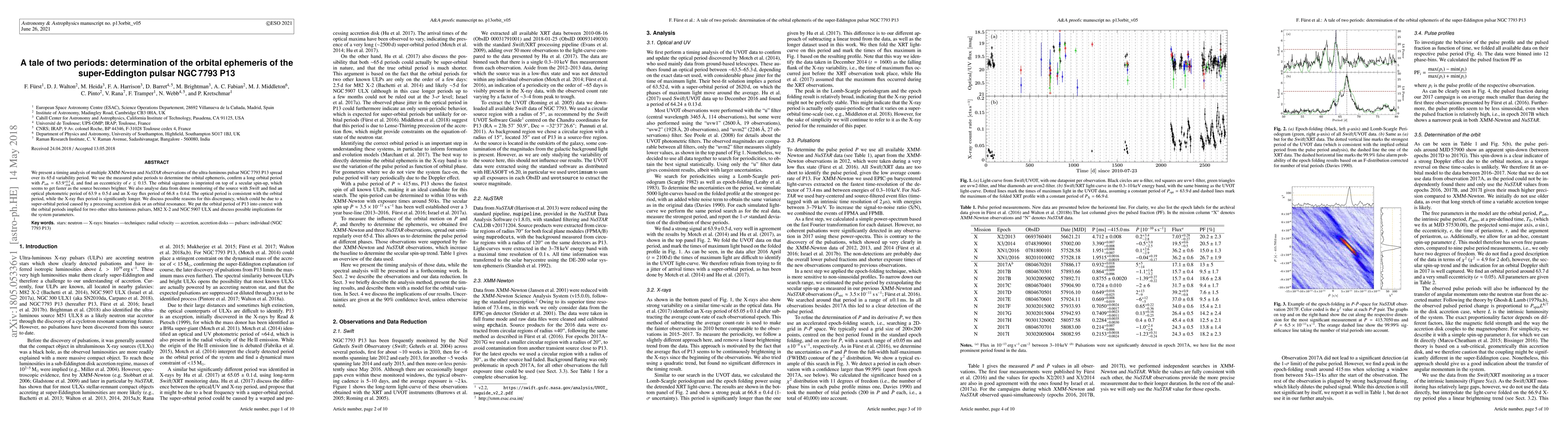 We present a timing analysis of multiple XMM-Newton and NuSTAR observations of the ultra-luminous pulsar NGC 7793 P13 spread over its 65d variability period. We use the measured pulse periods to determine the orbital ephemeris, confirm a long orbital period with P_orb = 63.9 (+0.5,-0.6) d, and find an eccentricity of e <= 0.15. The orbital signature is imprinted on top of a secular spin-up, which seems to get faster as the source becomes brighter. We also analyse data from dense monitoring of the source with Swift and find an optical photometric period of 63.9 +/- 0.5 d and an X-ray flux period of 66.8 +/- 0.4 d. The optical period is consistent with the orbital period, while the X-ray flux period is significantly longer. We discuss possible reasons for this discrepancy, which could be due to a super-orbital period caused by a precessing accretion disk or an orbital resonance. We put the orbital period of P13 into context with the orbital periods implied for two other ultra-luminous pulsars, M82 X-2 and NGC 5907 ULX and discuss possible implications for the system parameters.