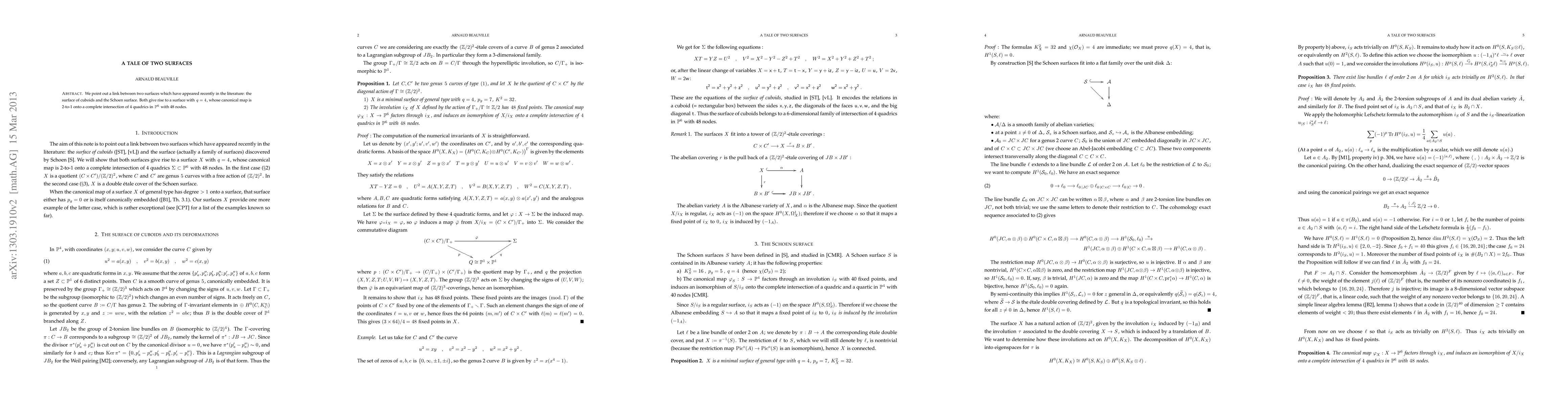 We point out a link between two surfaces which have appeared recently in the literature: the surface of cuboids and the Schoen surface. Both surfaces give rise to a surface with q=4, whose canonical map is 2-to-1 onto an intersection of 4 quadrics in P^6 with 48 nodes.