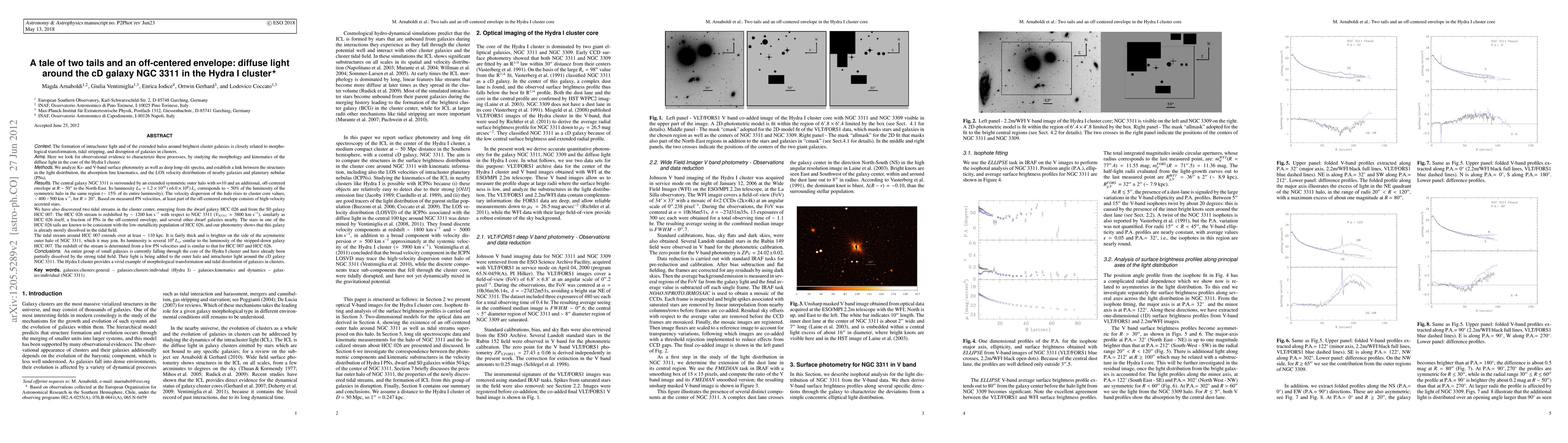 The formation of intracluster light and of the extended halos around brightest cluster galaxies is closely related to morphological transformation, tidal stripping, and disruption of galaxies in clusters. We analyze Ks- and V-band surface photometry as well as deep long-slit spectra, and establish a link between the structures in the light distribution, the absorption line kinematics, and the LOS velocity distributions of nearby galaxies and planetary nebulae (PNs). The central galaxy NGC 3311 is surrounded by an extended symmetric outer halo with n=10 and an additional, off-centered envelope ~ 50" to the North-East. Its luminosity L_V= 1.2x10^{10} +/- 6.0 x 10^8 L_sun corresponds to ~50 % of the luminosity of the symmetric halo in the same region. Based on measured PN velocities, at least part of the off-centered envelope consists of high-velocity accreted stars. We have also discovered two tidal streams in the cluster center, emerging from the dwarf galaxy HCC 026 and from the S0 galaxy HCC 007. The HCC 026 stream is redshifted by ~1200 km/s with respect to NGC 3311, similarly as HCC 026 itself, a fraction of PNs in the off-centered envelope, and several other dwarf galaxies nearby. The stars in one of the HCC 026 tails are known to be consistent with the low-metallicity population of HCC 026, and our photometry shows that this galaxy is already mostly dissolved in the tidal field. The tidal stream around HCC 007 extends over at least 110 kpc. It is fairly thick and is brighter on the side of the asymmetric outer halo of NGC 3311, which it may join. Its luminosity is several 10^9 L_sun, similar to the luminosity of the stripped-down galaxy HCC 007. The redshift of the stream is determined from a few PN velocities and is similar to that for HCC 007 and HCC 026.
