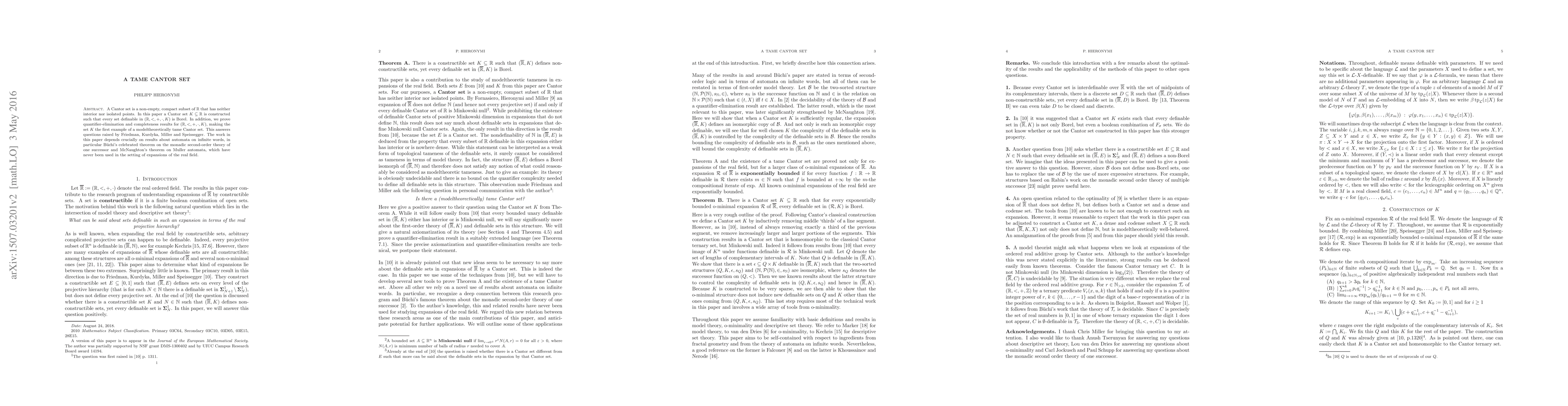 This paper constructs a Cantor set $K$ such that every set definable in $(\mathbb{R},<,+,\cdot,K)$ is Borel, proving quantifier-elimination and completeness for this structure, and thus establishing $K$ as the first model-theoretically tame Cantor set. The results rely on automata theory and B\"uchi's theorem.