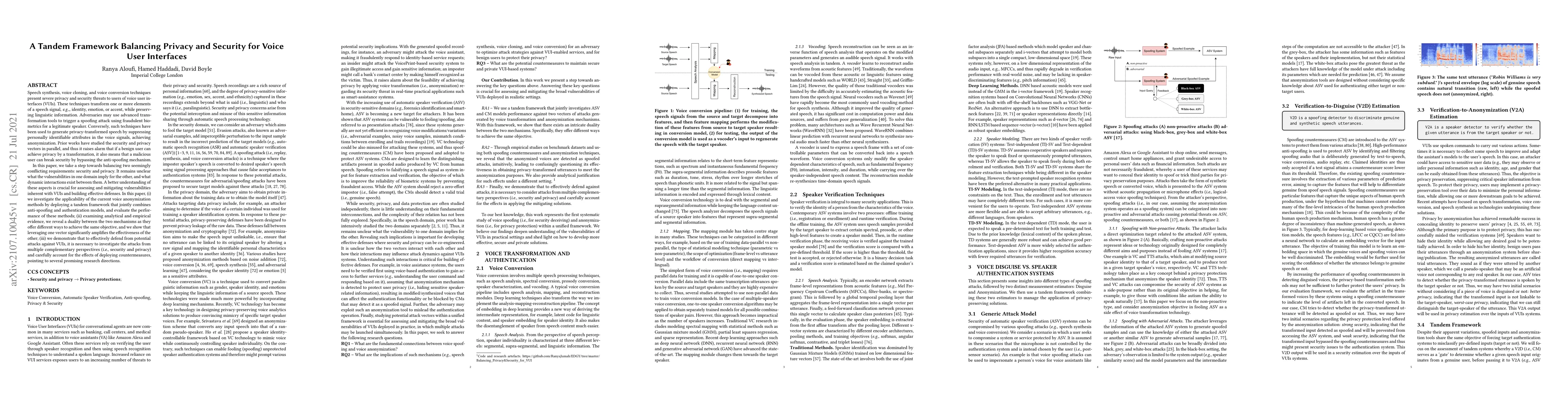 This paper proposes a tandem framework to balance privacy and security for voice user interfaces, exploring how voice anonymization methods can be combined with anti-spoofing models. It reveals a duality between privacy and security mechanisms, showing that leveraging one enhances the effectiveness of the other, and emphasizes the need for multi-perspective defenses against VUI attacks.
