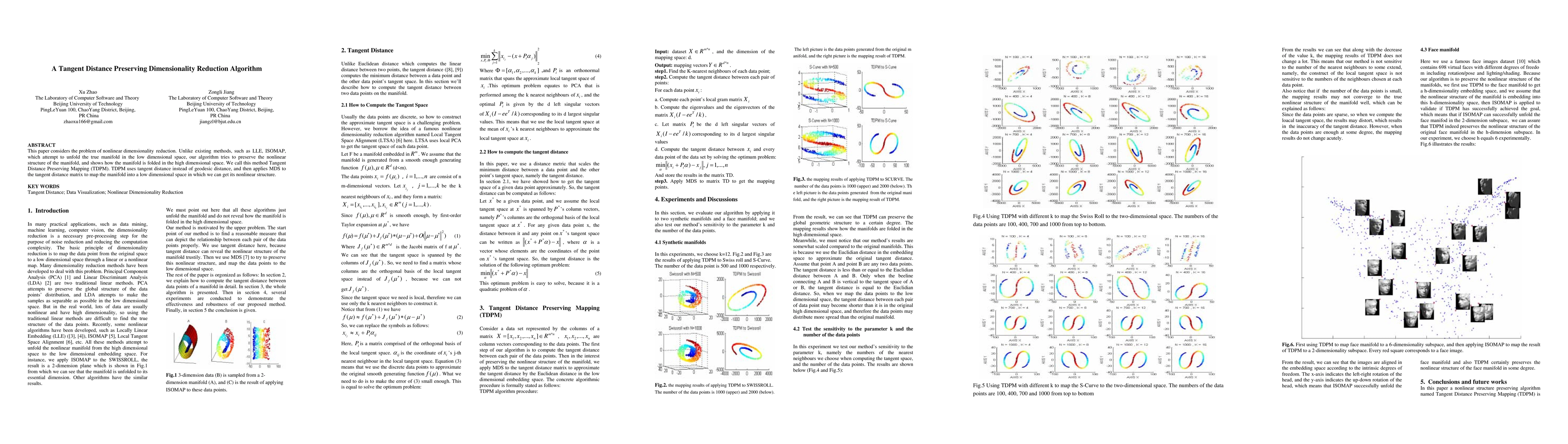 This paper considers the problem of nonlinear dimensionality reduction. Unlike existing methods, such as LLE, ISOMAP, which attempt to unfold the true manifold in the low dimensional space, our algorithm tries to preserve the nonlinear structure of the manifold, and shows how the manifold is folded in the high dimensional space. We call this method Tangent Distance Preserving Mapping (TDPM). TDPM uses tangent distance instead of geodesic distance, and then applies MDS to the tangent distance matrix to map the manifold into a low dimensional space in which we can get its nonlinear structure.