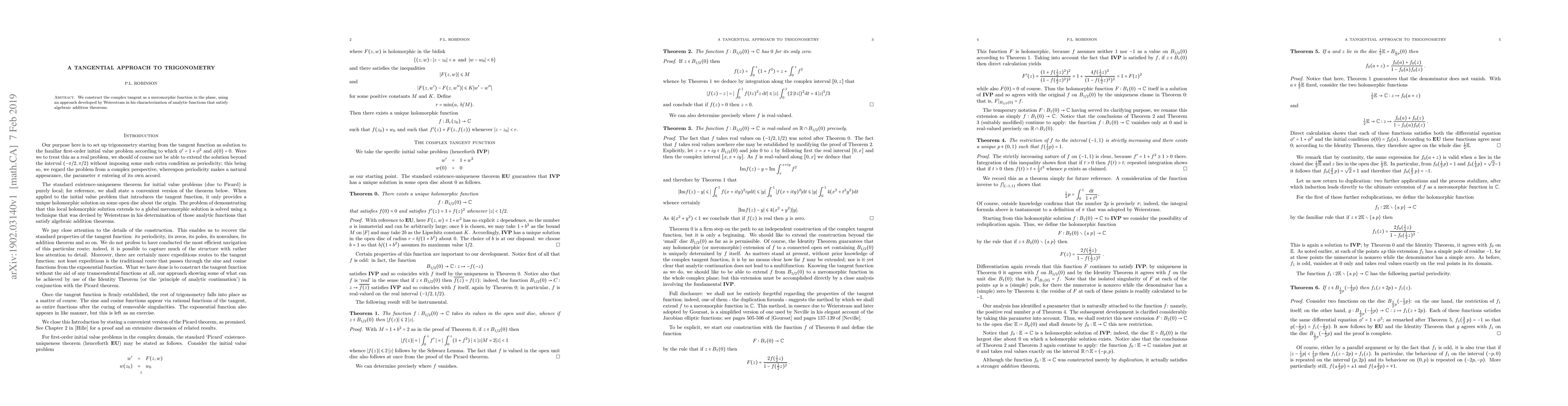 We construct the complex tangent as a meromorphic function in the plane, using an approach developed by Weierstrass in his characterization of analytic functions that satisfy algebraic addition theorems.