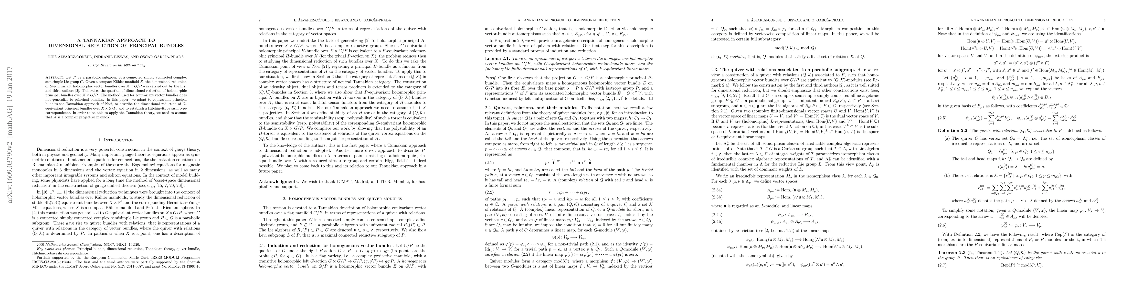 This paper adapts Nori's Tannakian approach to dimensionally reduce $G$-equivariant holomorphic principal bundles over $X \times G/P$, establishing a Hitchin-Kobayashi correspondence, under the assumption that $X$ is a complex projective manifold. The method extends beyond vector bundles to principal bundles, overcoming previous limitations.