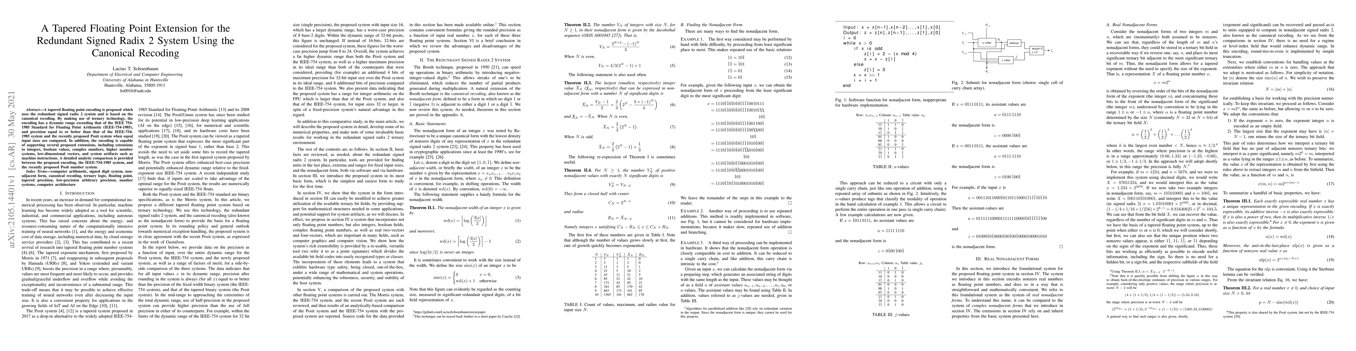 A tapered floating point encoding is proposed which uses the redundant signed radix 2 system and is based on the canonical recoding. By making use of ternary technology, the encoding has a dynamic range exceeding that of the recently-proposed Posit number system and the IEEE 754-1985 Standard for Floating Point Arithmetic (IEEE-754-1985), and precision equal to or better than that of the IEEE-754-1985 system and the recently proposed Posit system when equal input sizes are compared. In addition, the encoding is capable of supporting several proposed extensions, including extensions to integers, boolean values, complex numbers, higher number systems, low-dimensional vectors, and system artifacts such as machine instructions. A detailed analytic comparison is provided between the proposed encoding, the IEEE-754-1985 system, and the recently proposed Posit number system.