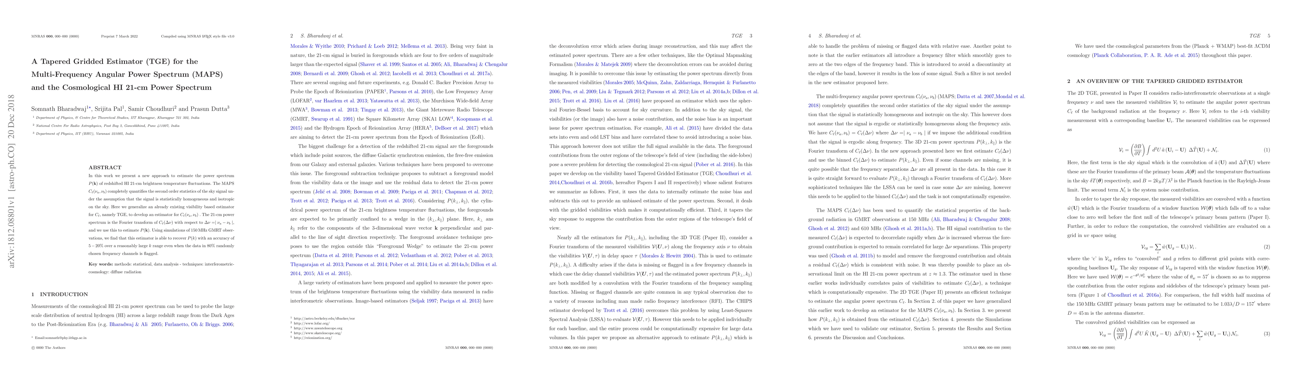 In this work we present a new approach to estimate the power spectrum $P({\bf k})$ of redshifted HI 21-cm brightness temperature fluctuations. The MAPS $C_{\ell}(\nu_a,\nu_b)$ completely quantifies the second order statistics of the sky signal under the assumption that the signal is statistically homogeneous and isotropic on the sky. Here we generalize an already existing visibility based estimator for $C_{\ell}$, namely TGE, to develop an estimator for $C_{\ell}(\nu_a,\nu_b)$. The 21-cm power spectrum is the Fourier transform of $C_{\ell}(\Delta \nu)$ with respect to $\Delta \nu=\mid \nu_a-\nu_b \mid$, and we use this to estimate $P({\bf k})$. Using simulations of $150 \, {\rm MHz}$ GMRT observations, we find that this estimator is able to recover $P(k)$ with an accuracy of $5-20 \%$ over a reasonably large $k$ range even when the data in $80 \%$ randomly chosen frequency channels is flagged.
