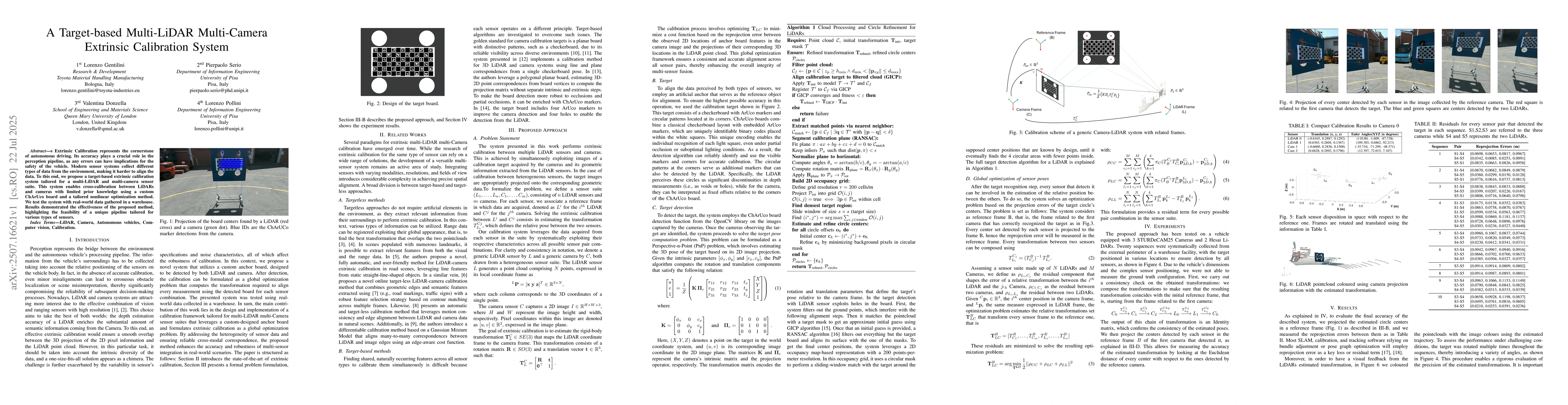 The research proposes a target-based extrinsic calibration system for multi-LiDAR and multi-camera sensor suites, utilizing a custom ChArUco board and a nonlinear optimization method for cross-calibration with limited prior knowledge.