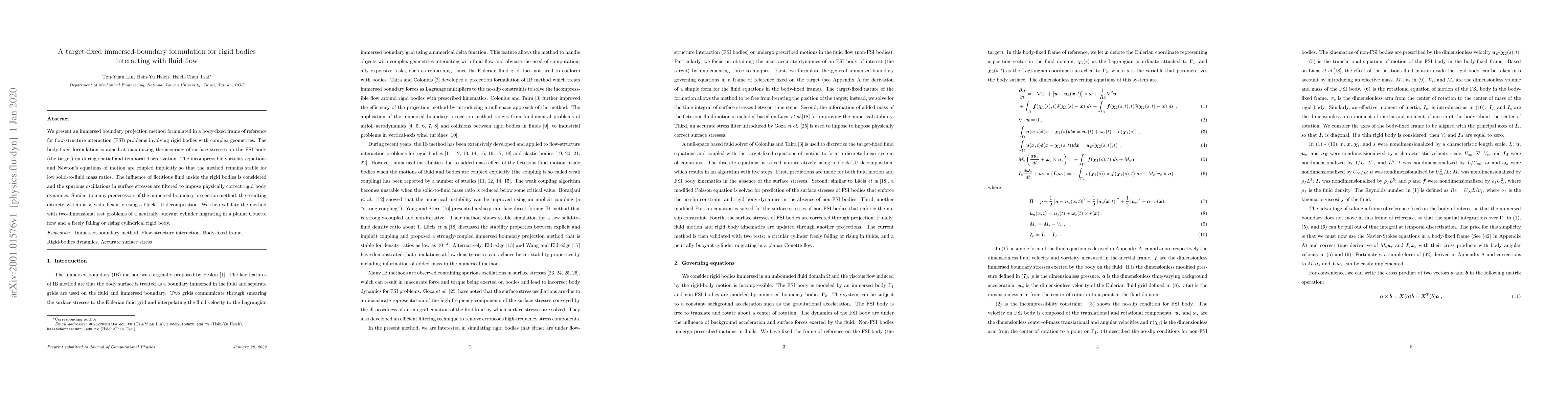 We present an immersed boundary projection method formulated in a body-fixed frame of reference for flow-structure interaction (FSI) problems involving rigid bodies with complex geometries. The body-fixed formulation is aimed at maximizing the accuracy of surface stresses on the FSI body (the target) on during spatial and temporal discretization. The incompressible vorticity equations and Newton's equations of motion are coupled implicitly so that the method remains stable for low solid-to-fluid mass ratios. The influence of fictitious fluid inside the rigid bodies is considered and the spurious oscillations in surface stresses are filtered to impose physically correct rigid body dynamics. Similar to many predecessors of the immersed boundary projection method, the resulting discrete system is solved efficiently using a block-LU decomposition. We then validate the method with two-dimensional test problems of a neutrally buoyant cylinder migrating in a planar Couette flow and a freely falling or rising cylindrical rigid body.