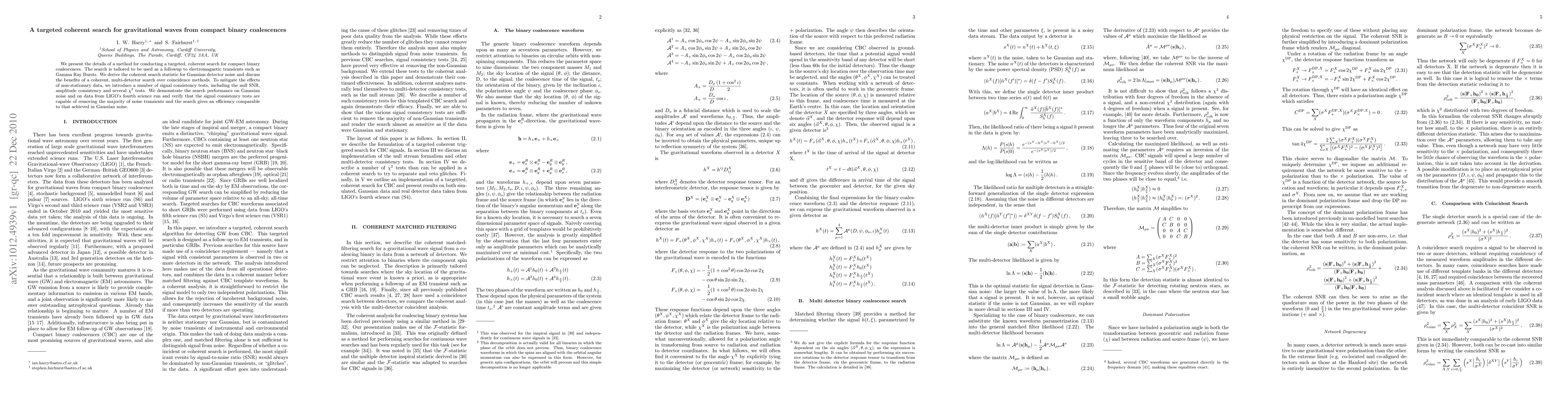 We present the details of a method for conducting a targeted, coherent search for compact binary coalescences. The search is tailored to be used as a followup to electromagnetic transients such as Gamma Ray Bursts. We derive the coherent search statistic for Gaussian detector noise and discuss the benefits of a coherent, multi-detector search over coincidence methods. To mitigate the effects of non-stationary data, we introduce a number of signal consistency tests, including the null SNR, amplitude consistency and several $\chi^{2}$ tests. We demonstrate the search performance on Gaussian noise and on data from LIGO's fourth science run and verify that the signal consistency tests are capable of removing the majority of noise transients and the search gives an efficiency comparable to that achieved in Gaussian noise.