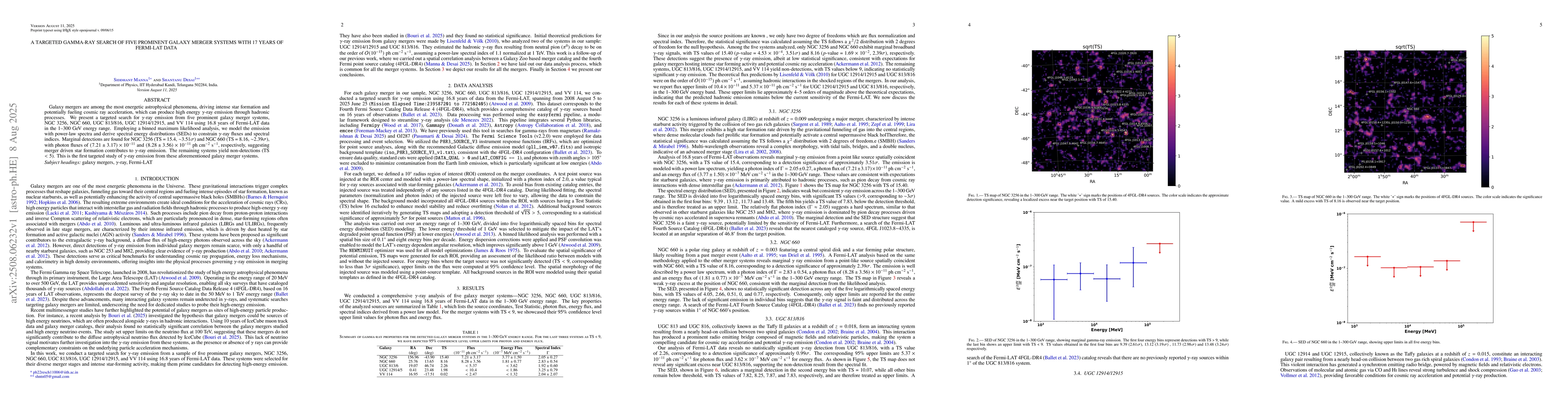 This study conducted a targeted search for gamma-ray emission from five galaxy merger systems using 16.8 years of Fermi-LAT data in the 1-300 GeV energy range. The emission was modeled with power-law spectra and spectral energy distributions (SEDs) were derived to constrain gamma-ray fluxes and spectral indices.