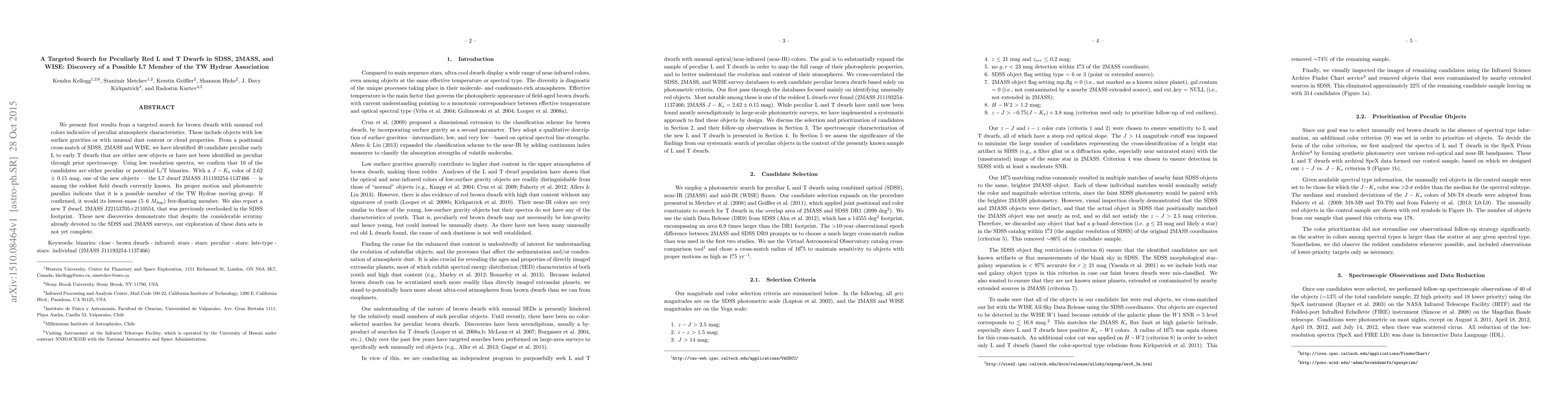 We present first results from a targeted search for brown dwarfs with unusual red colors indicative of peculiar atmospheric characteristics. These include objects with low surface gravities or with unusual dust content or cloud properties. From a positional cross-match of SDSS, 2MASS and WISE, we have identified 40 candidate peculiar early L to early T dwarfs that are either new objects or have not been identified as peculiar through prior spectroscopy. Using low resolution spectra, we confirm that 10 of the candidates are either peculiar or potential L/T binaries. With a J-Ks color of 2.62 +/- 0.15 mag, one of the new objects --- the L7 dwarf 2MASS J11193254-1137466 --- is among the reddest field dwarfs currently known. Its proper motion and photometric parallax indicate that it is a possible member of the TW Hydrae moving group. If confirmed, it would its lowest-mass (5--6 MJup) free-floating member. We also report a new T dwarf, 2MASS J22153705+2110554, that was previously overlooked in the SDSS footprint. These new discoveries demonstrate that despite the considerable scrutiny already devoted to the SDSS and 2MASS surveys, our exploration of these data sets is not yet complete.